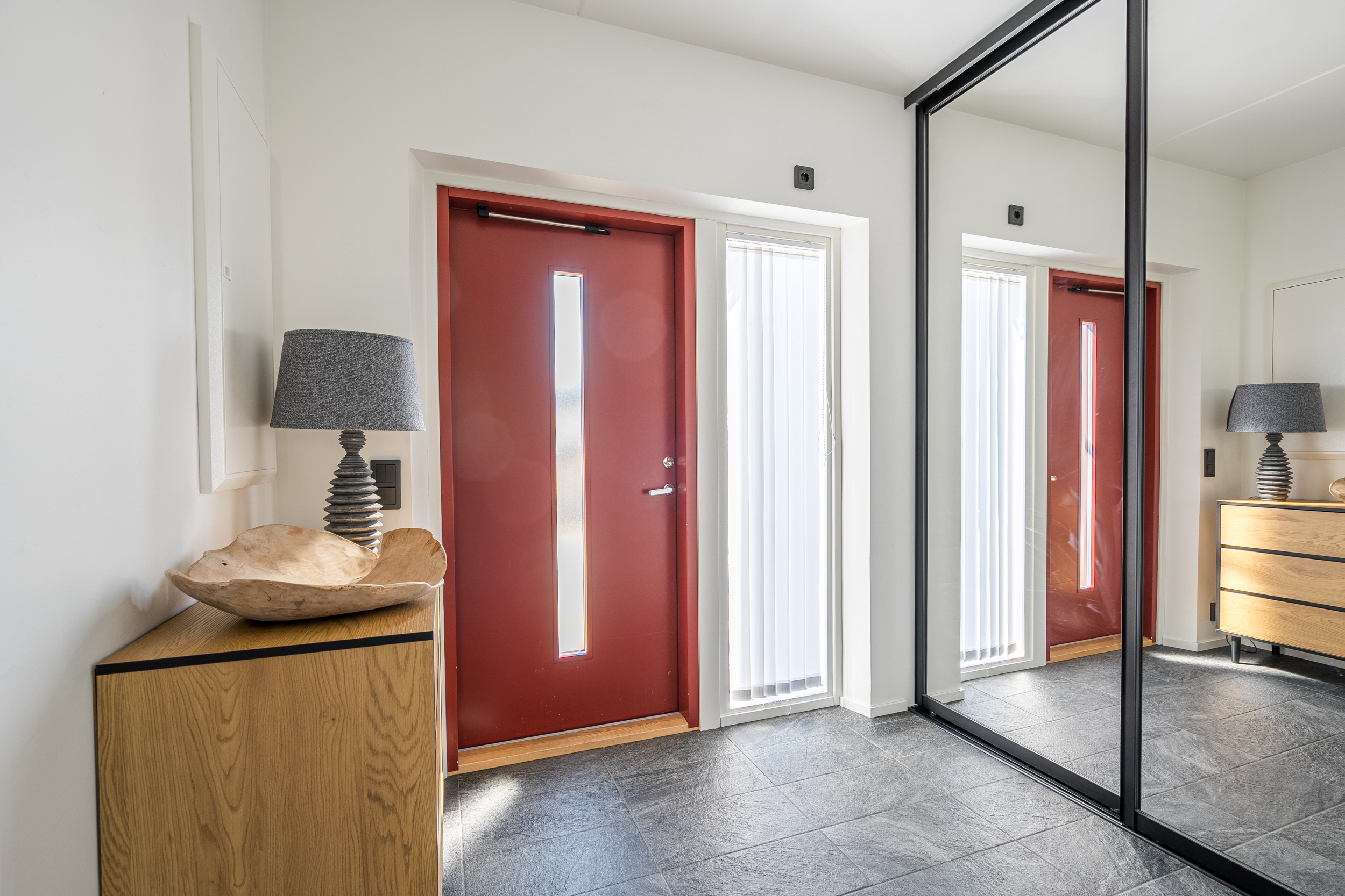 När du kliver in möts du av en praktisk och möblerbar hall med gott om förvaringsmöjligheter bakom skjutdörrar med spegelglas.