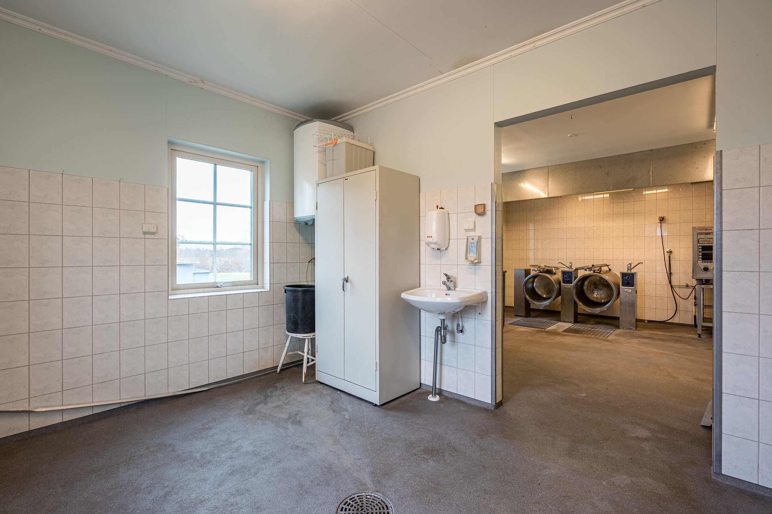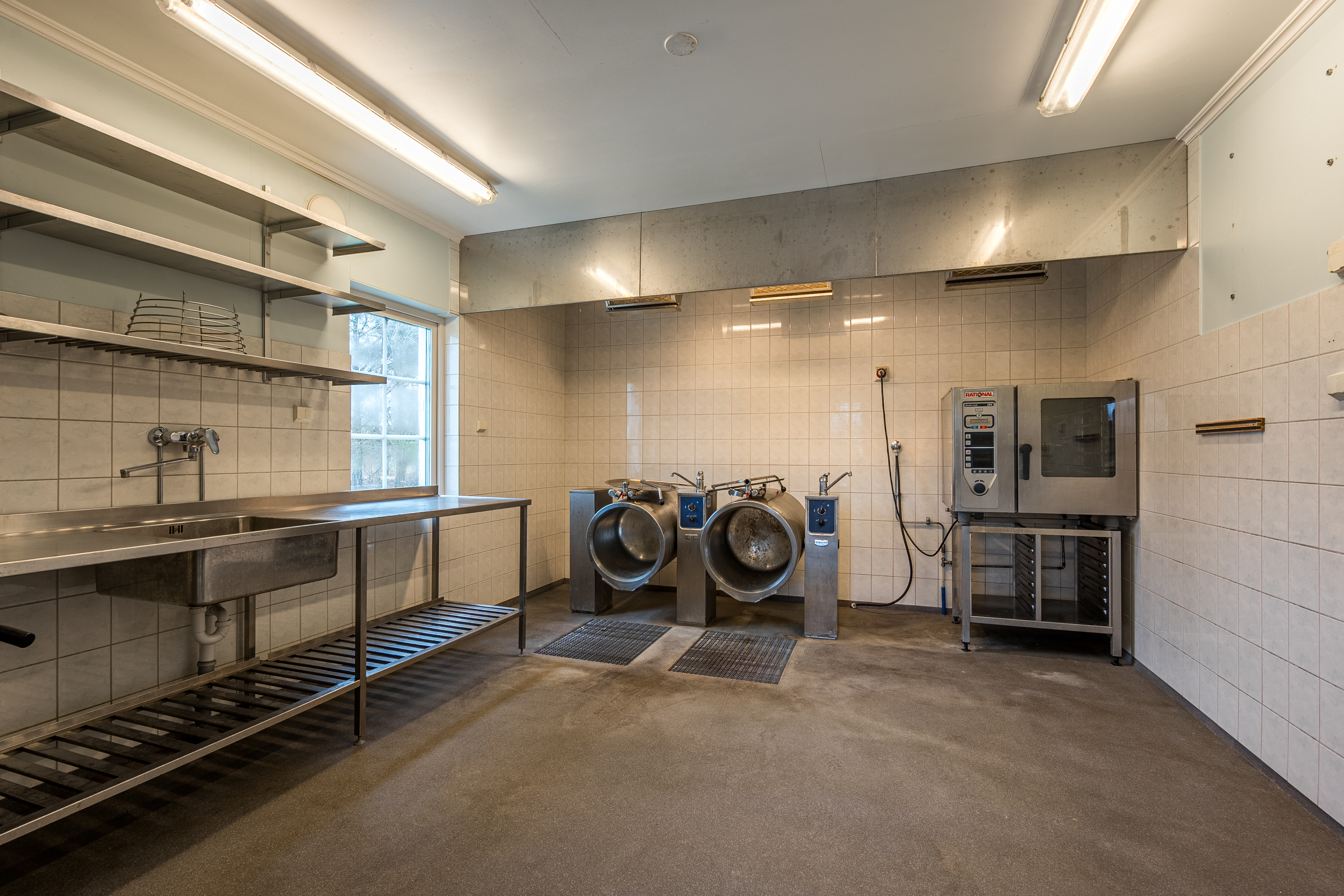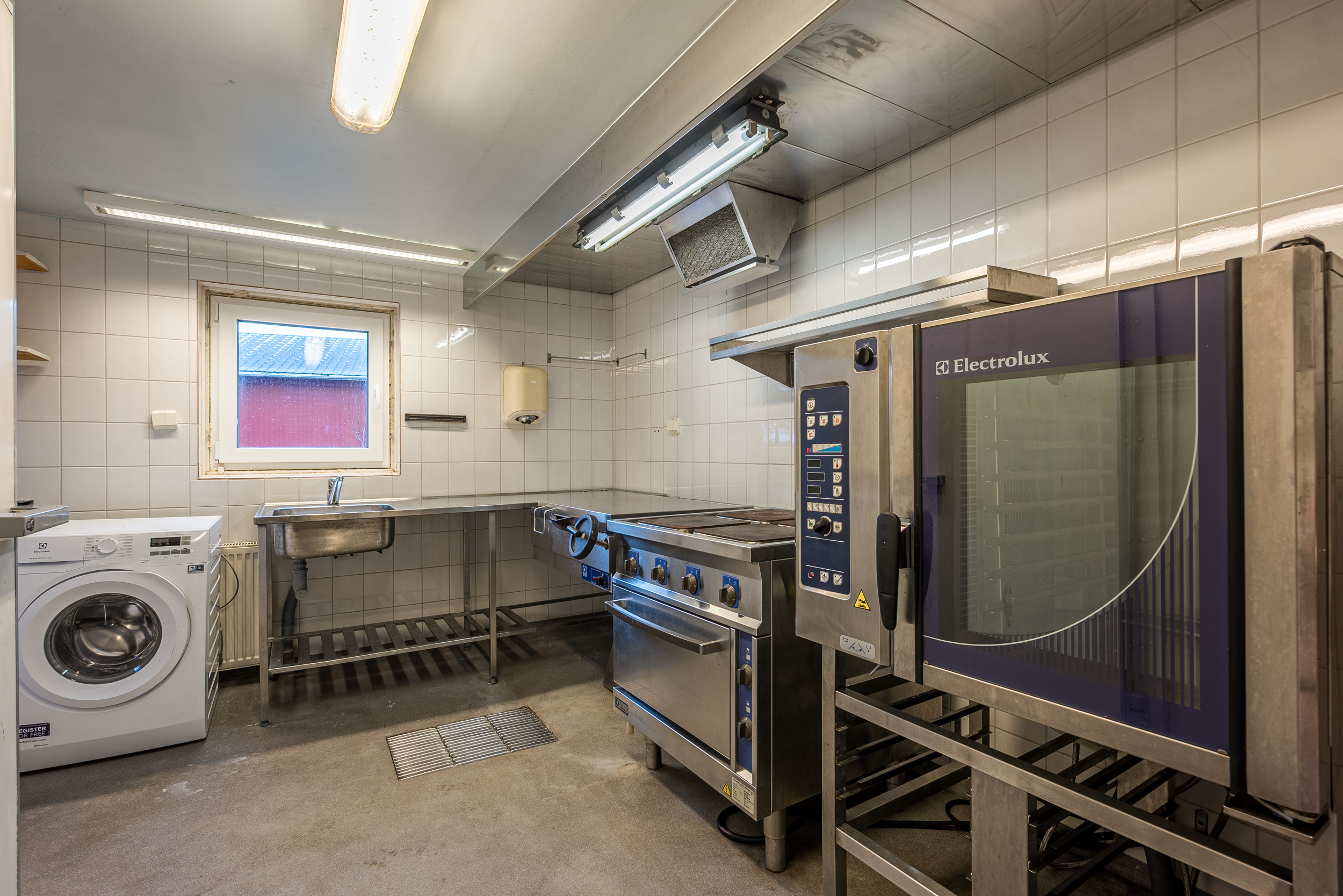 Köks- och lagerbyggnaden nyuppfördes 2003 och är uppförd som ett platsbyggt lösvirkeshus på värmeisolerad betongplatta, ytterfasader i målad träpanel och yttertak klätt med tegelpannor. Byggnaden är 110 kvm stor och inrymmer ett tillredningskök avsett för större matberedning, stora kylskåp samt ett rymligt lager och förråd/garage. Den är varmbonad och uppvärms med eluppvärmning, dels genom golvslingor och dels genom radiatorer. Byggnaden saknar wc och sociala utrymmen och tillredningsköket är för tillfället inte i drift, men är i gott skick.
