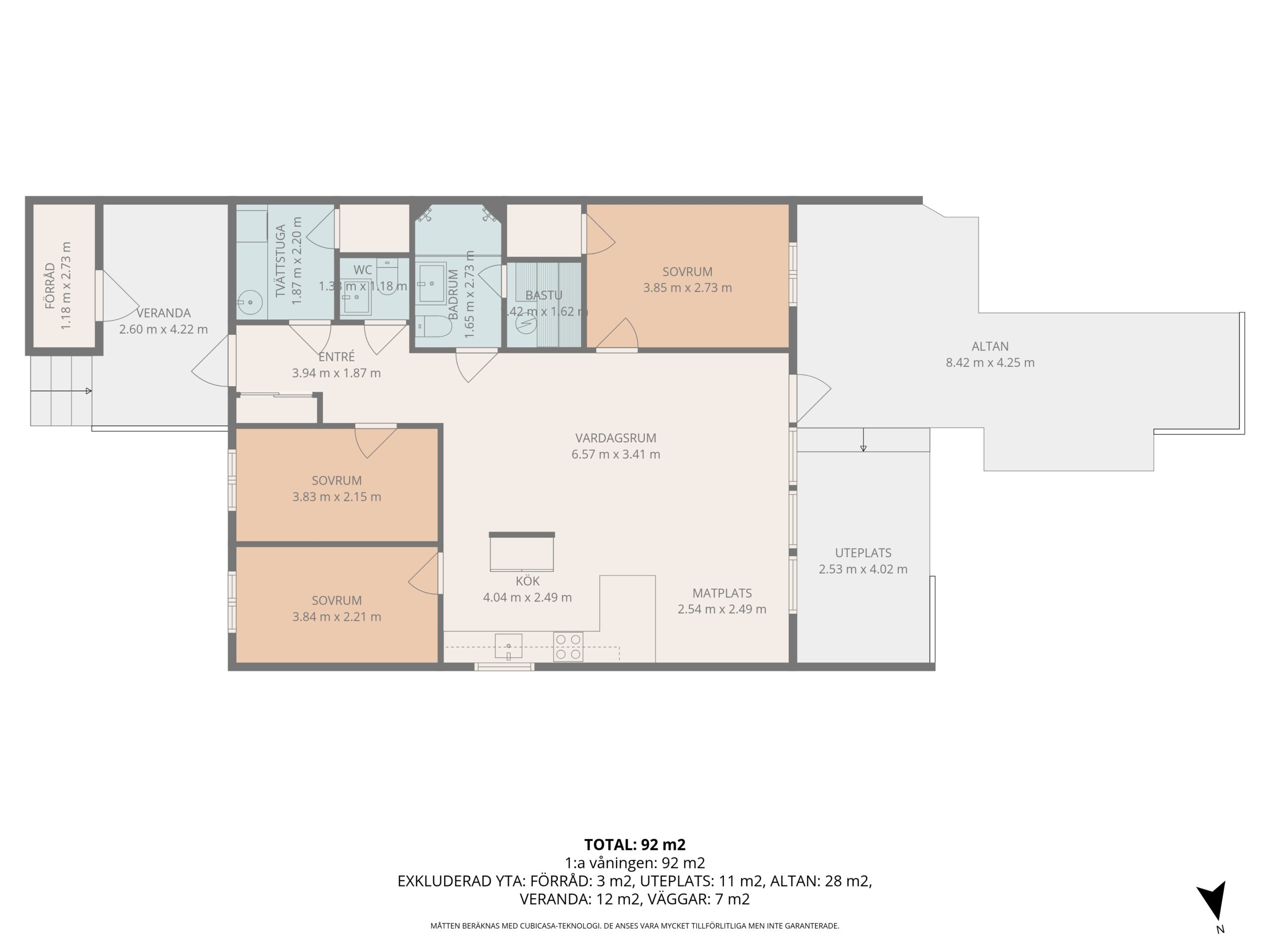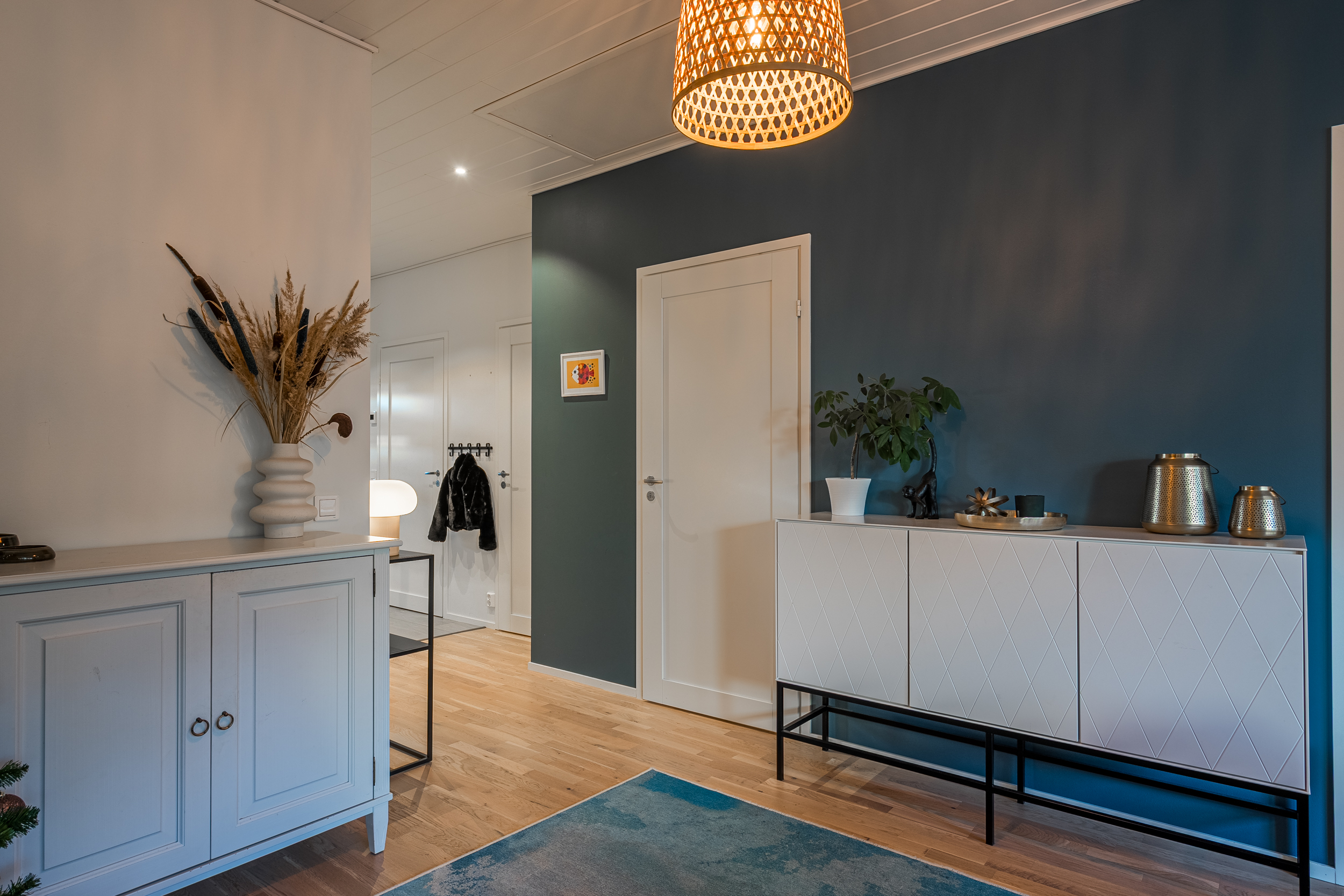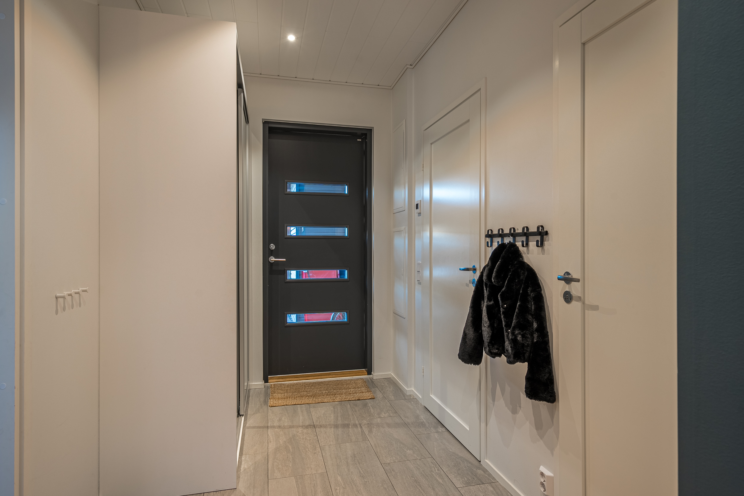 Välkomnande entré under tak som leder till entréhall med klädförvaring i garderob med skjutdörrar. Slitstarkt klinkergolv som är lätt att hålla rent och städat.