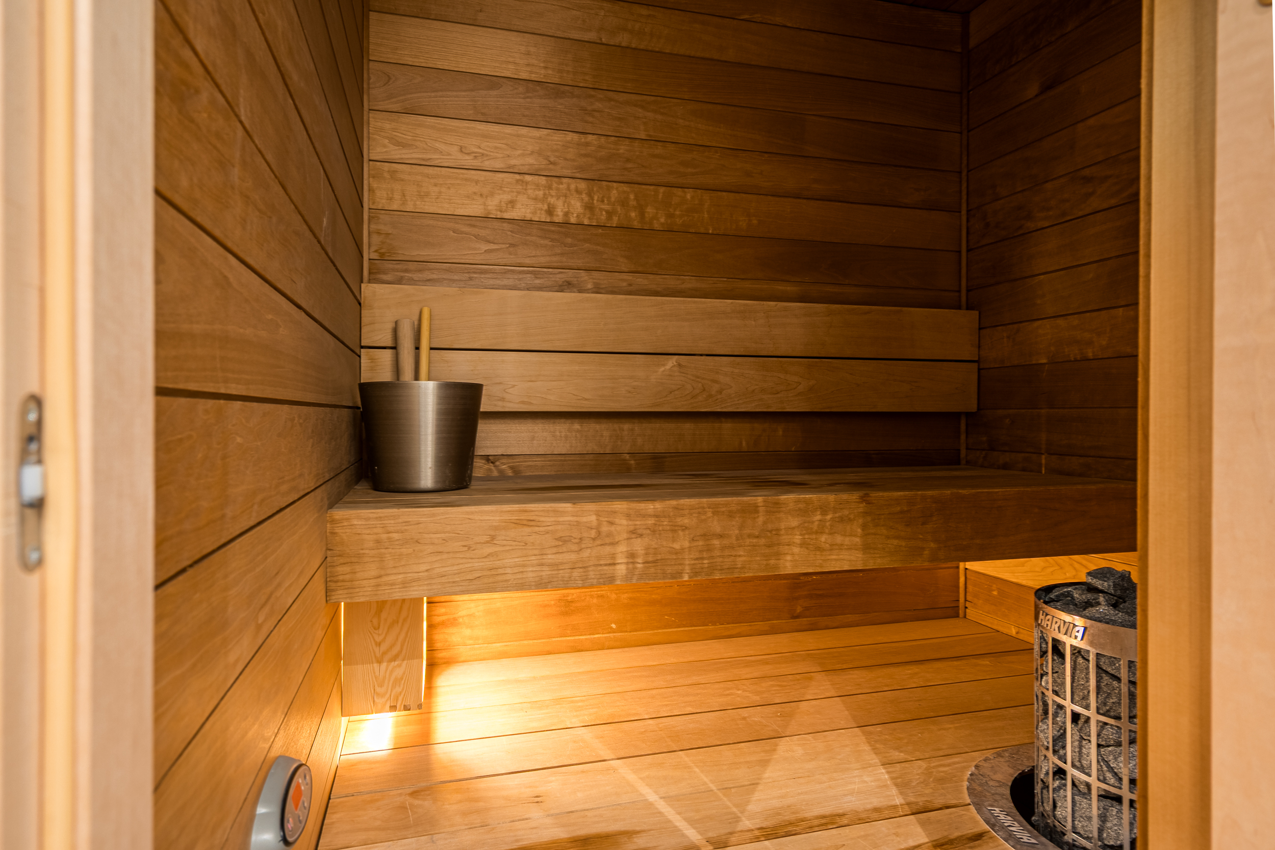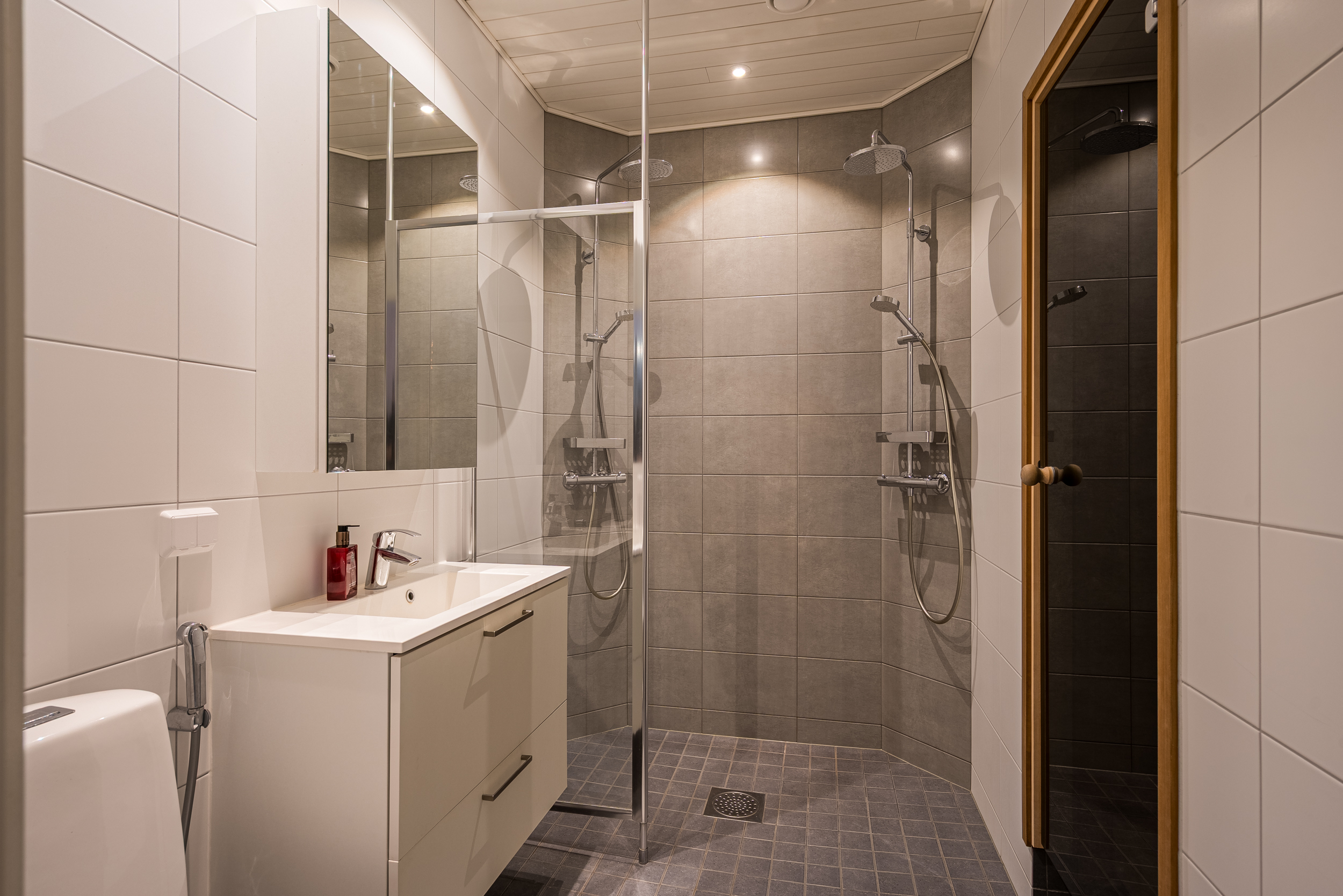 Ljust och stilrent badrum med bastu. Två duschar bakom duschvägg i glas, handfat med tillhörande kommod, överskåp med spegelglas, WC. Utrymmet är helkaklat med stora rektangulära kakel samt kvadratiska klinkers på golv.
