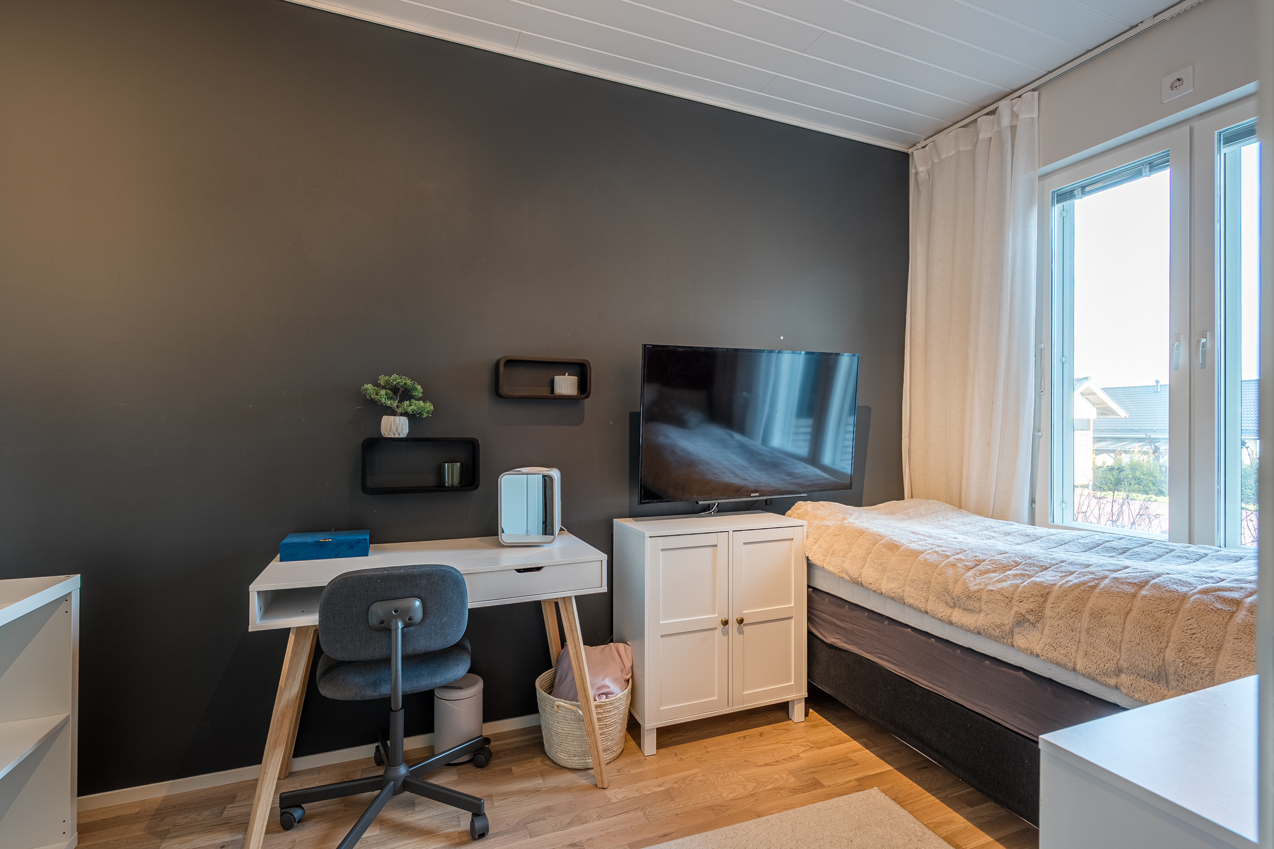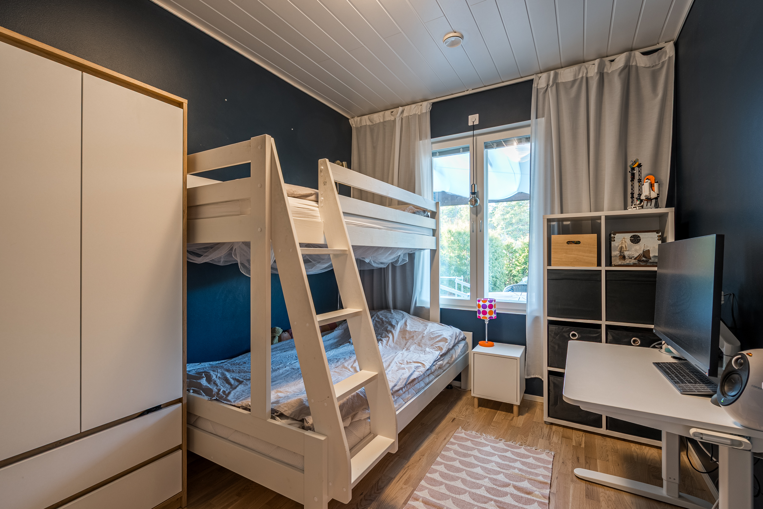 Tre sovrum där två av dessa har förvaring i garderober, master bedroom har förvaring i klädkammare. Sovrumsväggarna är målade i lugna, harmoniska färger och golvet består av parkettgolv som också är genomgående i övriga utrymmen.