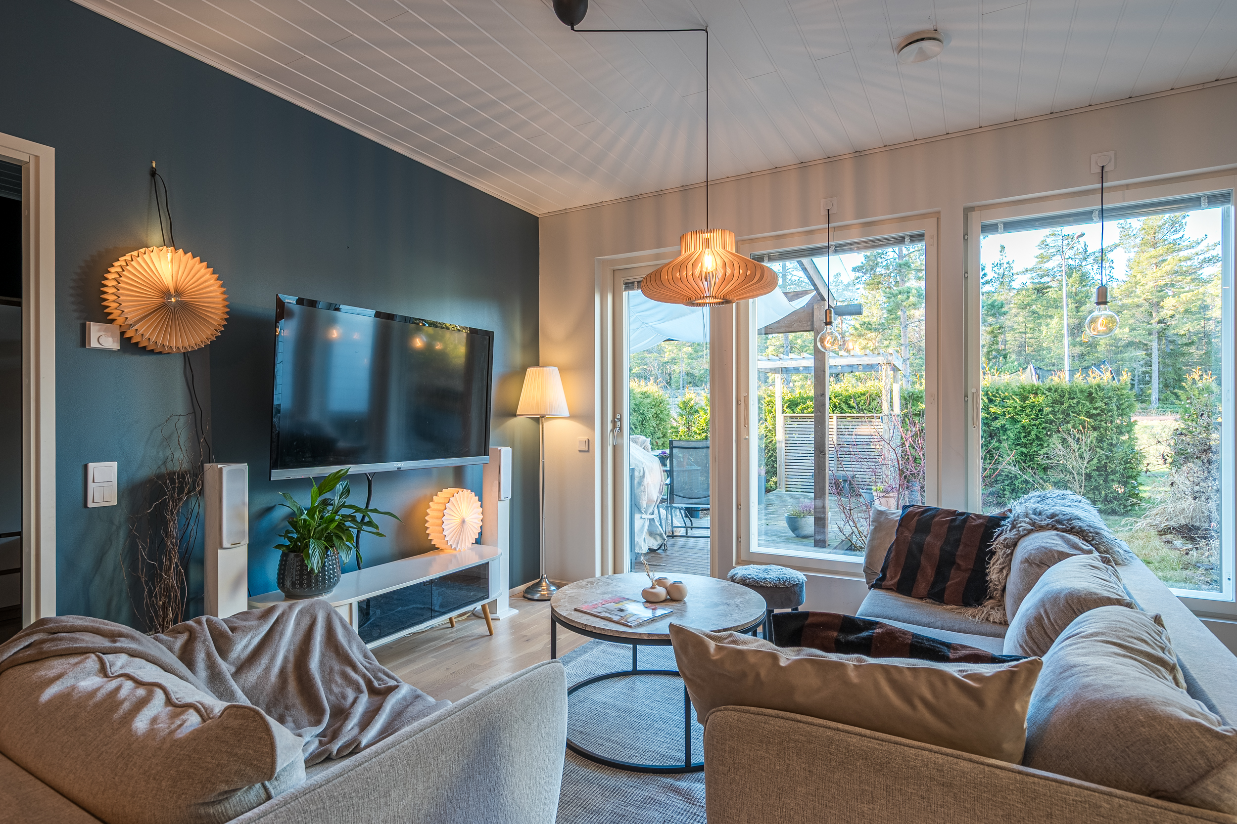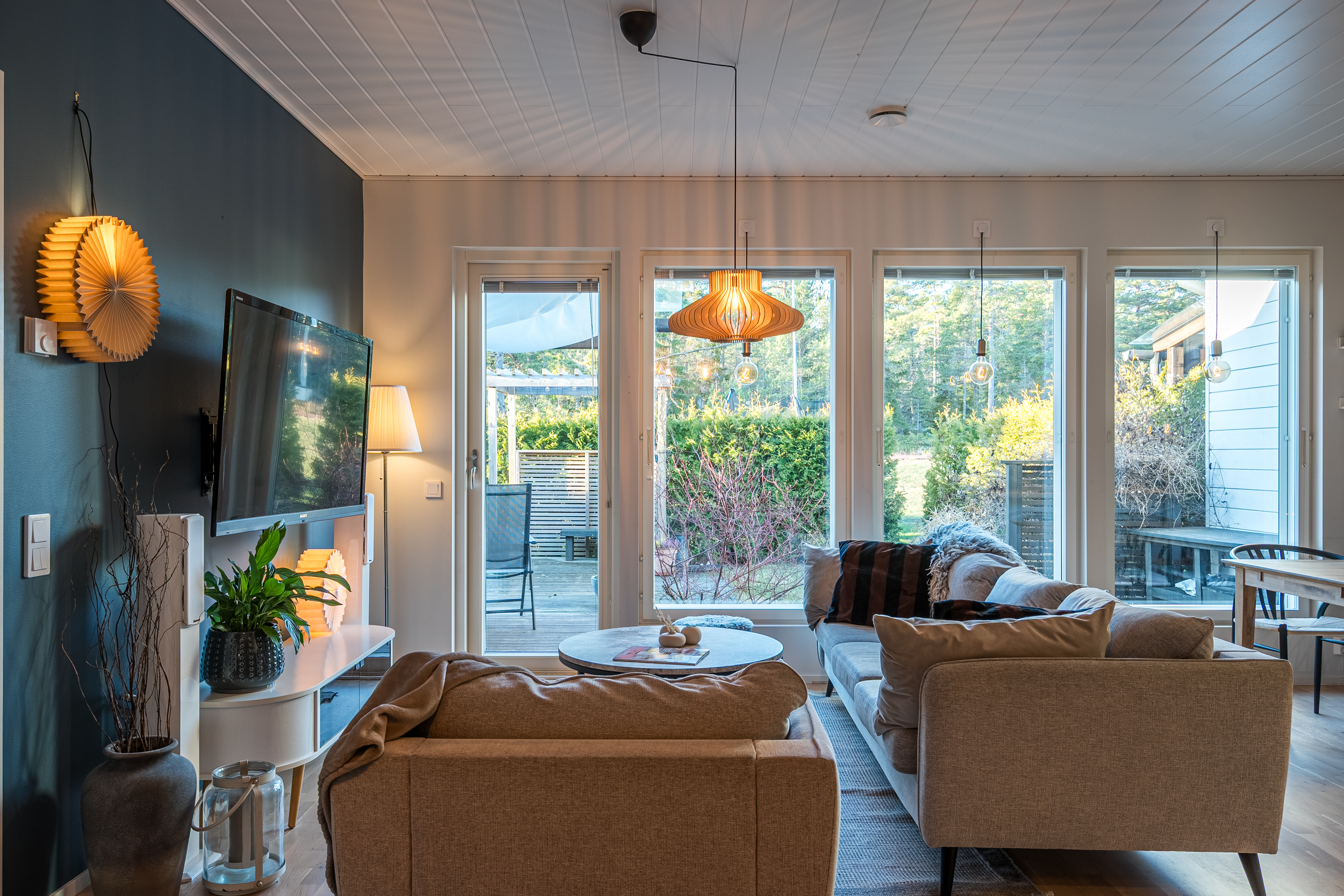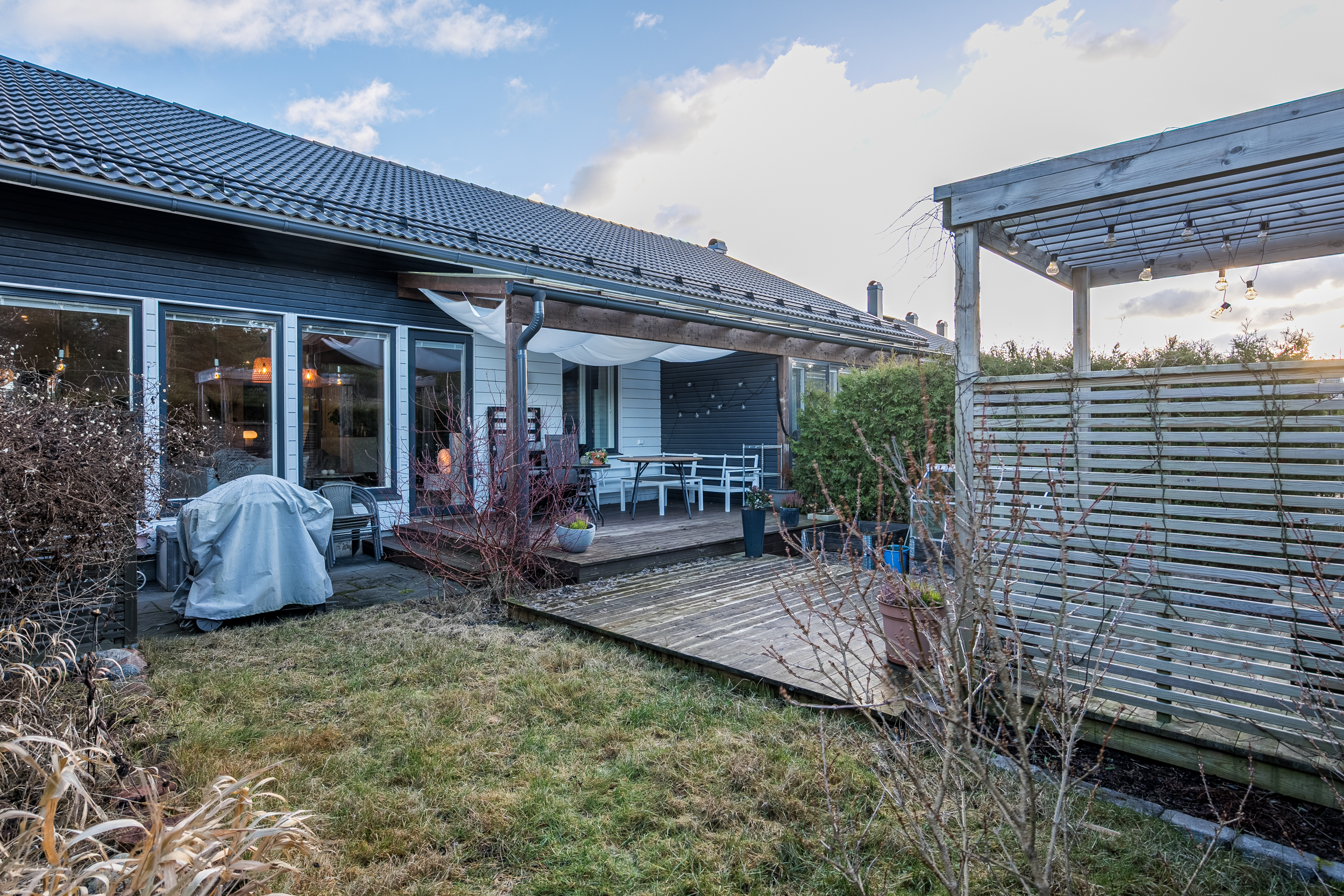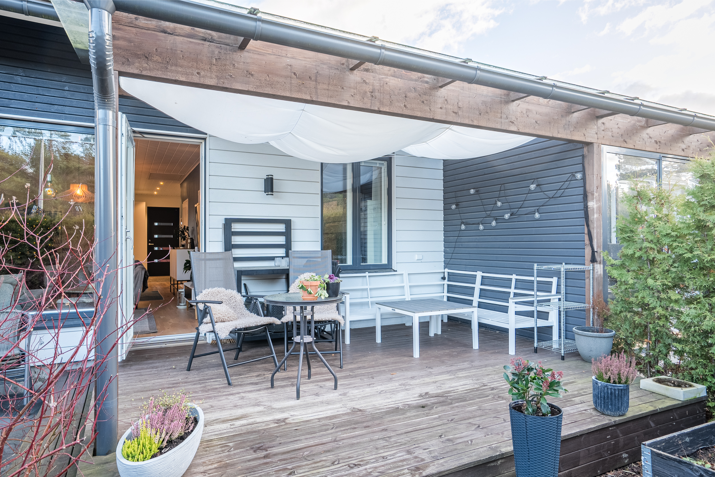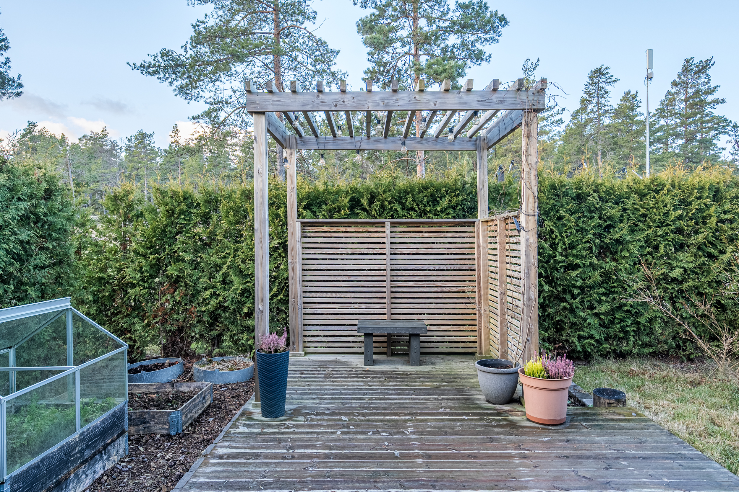 Från vardagsrummet finns utgång till din egna lilla “oas”. Vackert planerad tomt med terrass, planteringar samt gräsmatta. En del av terrassen är under tak och tomten har tuija-häck planterad som ger ett fint insynsskydd.