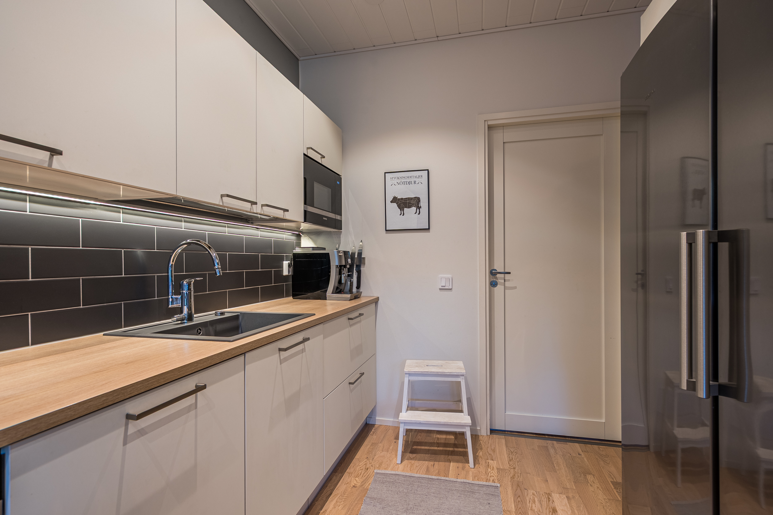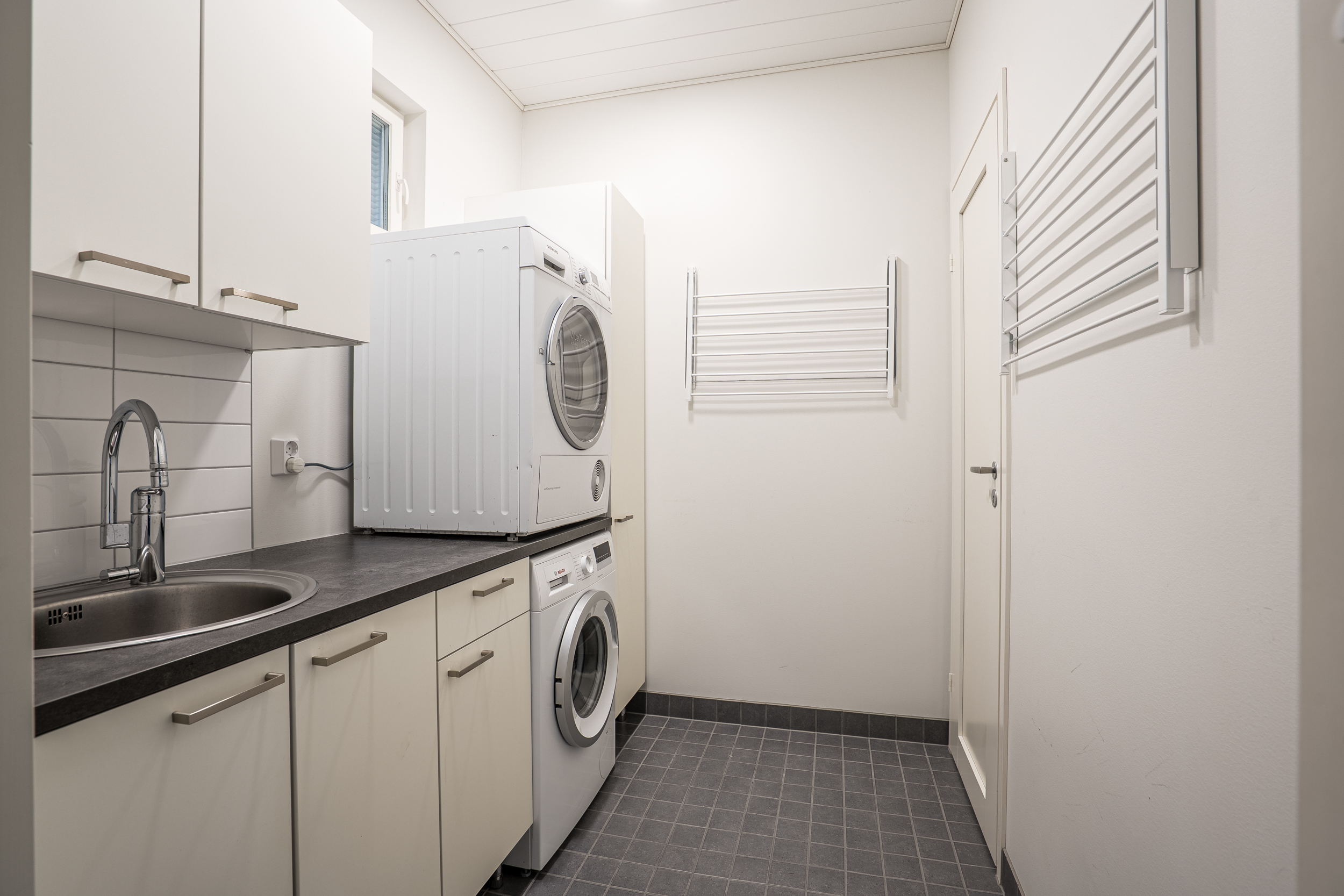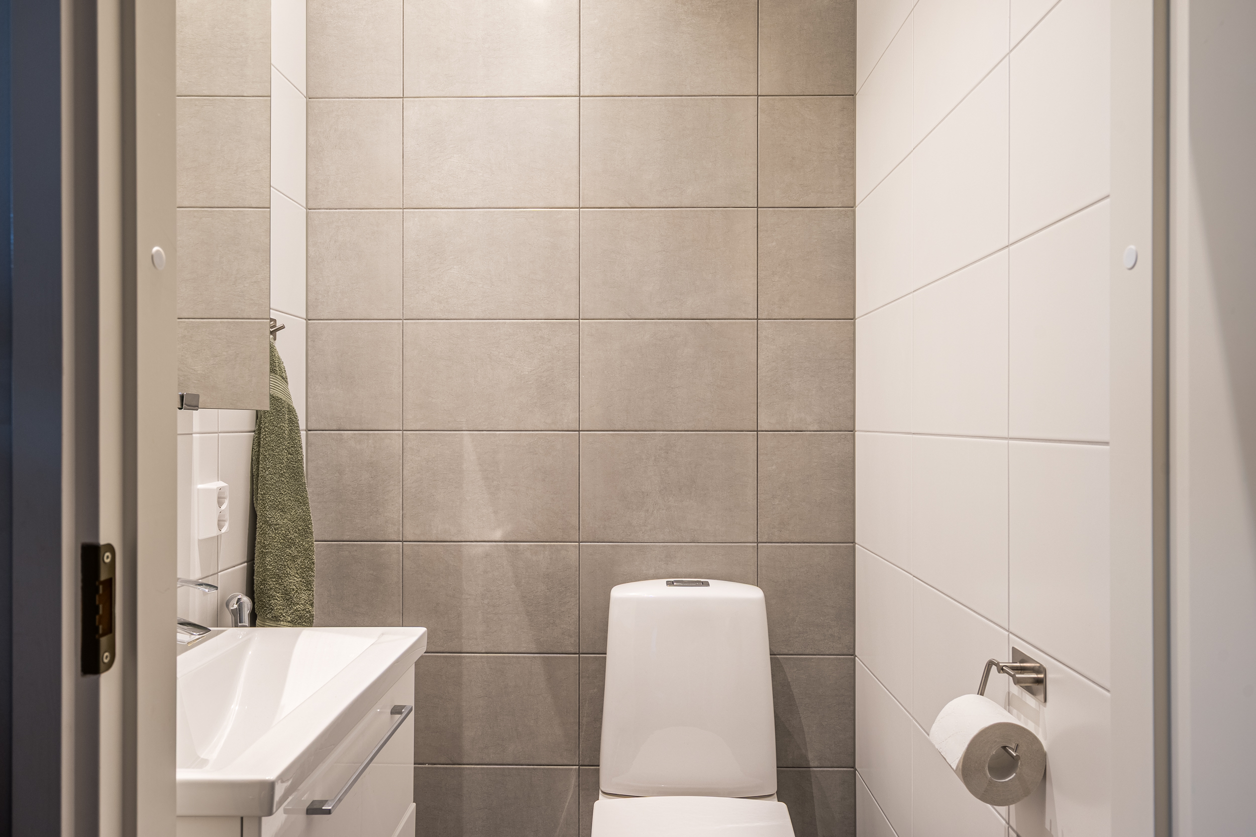 I anslutning till hallen finns gäst-wc samt rymlig tvättstuga som underlättar klädlogistiken. Även tvättstugan har skåpinredning från Puustelli. Tvättmaskin och torktumlare i pelaruppställning medföljer köpet. Separat förvaring i klädkammare.