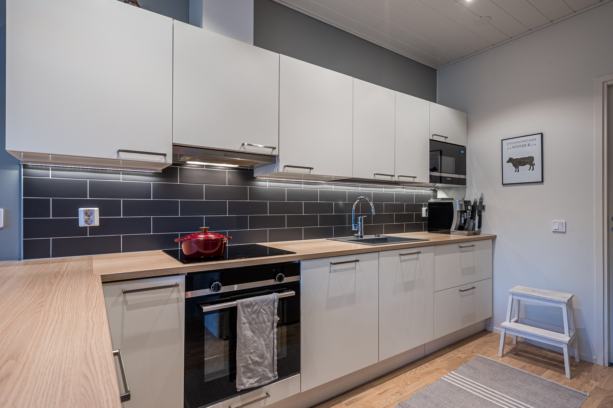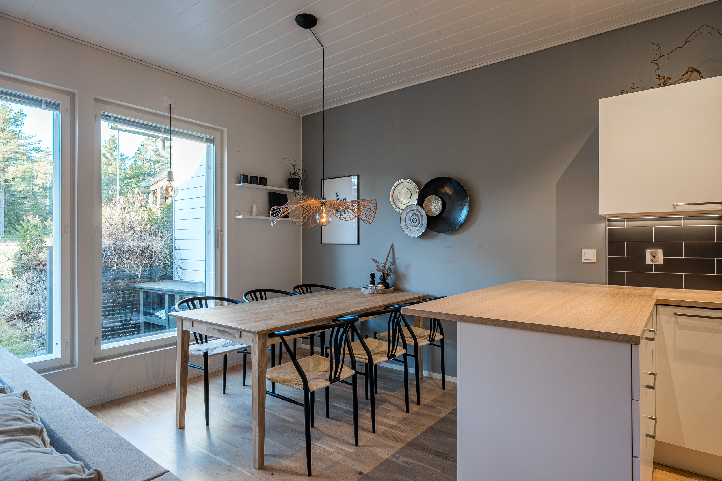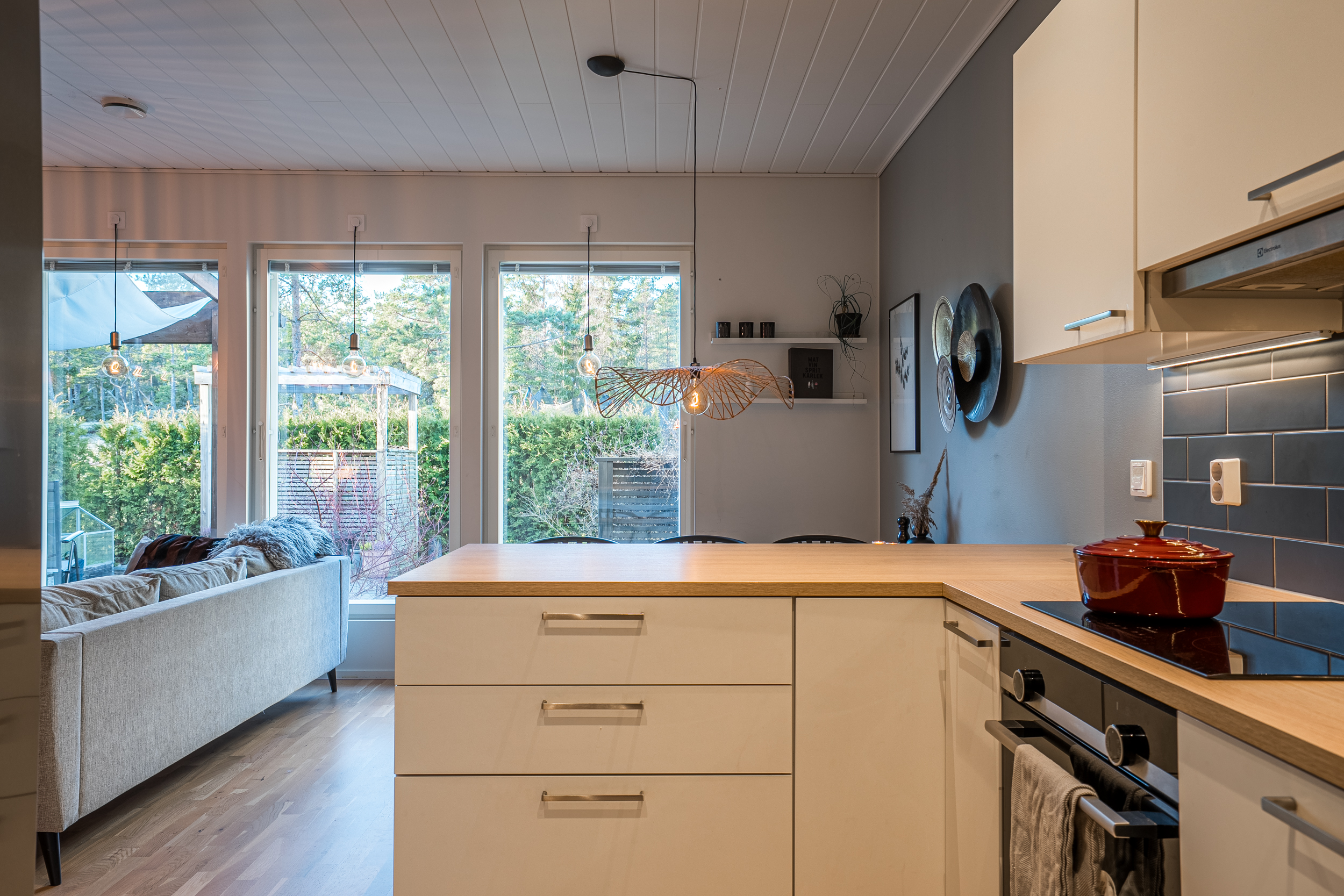 Kök och vardagsrum i öppen planlösning som tillsammans med uteplatsen erbjuder fina sociala utrymmen. Köksinredning från Puustelli samt vitvaror i form av diskmaskin, ugn, spishäll, micro, hel kyl och hel frys från Siemens. Micro och ugn placerad i bekväm arbetshöjd. Kaklad vägg ovan arbetsbänk. Vackert ljusinsläpp från väl tilltagna fönsterpartier mot väster.