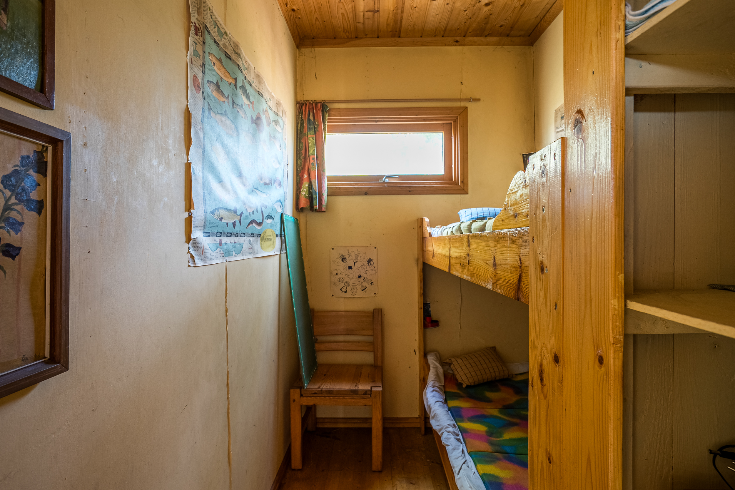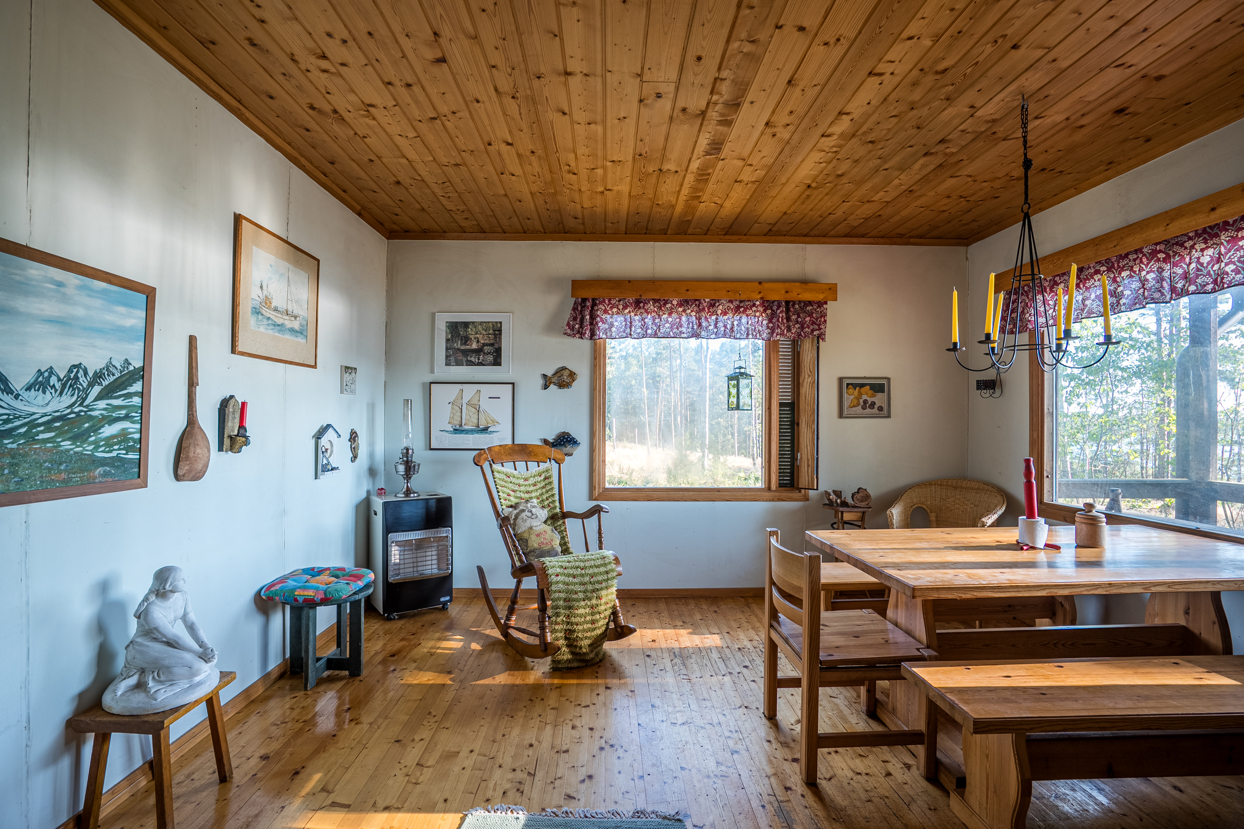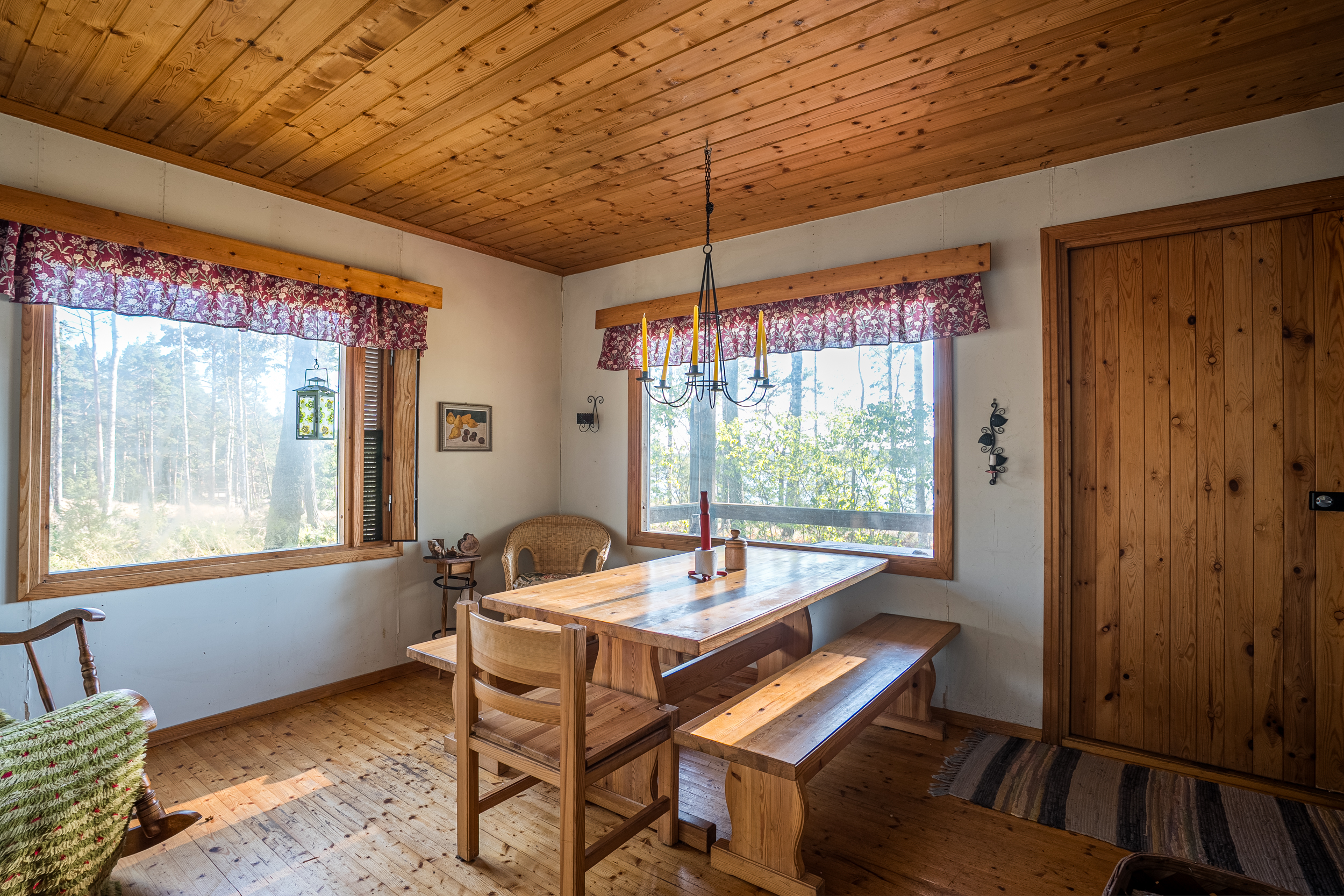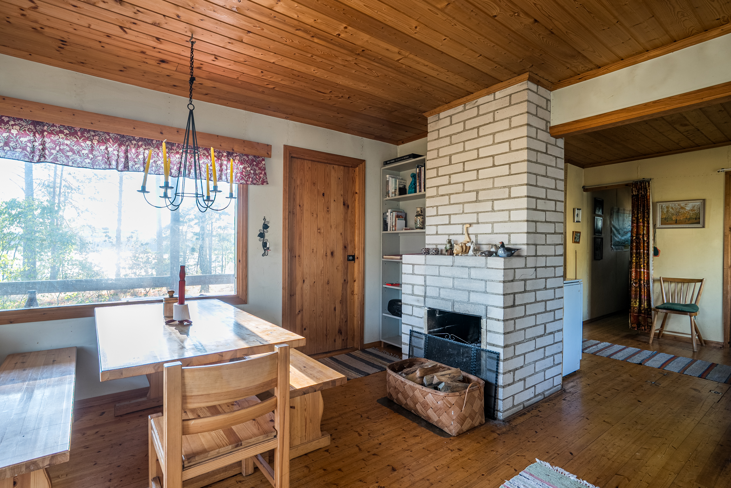 Fritidshuset är uppfört under 1970-talet i träkonstruktion ovan plintar. Fasaden utgörs av liggande träpanel och yttertak av plåt. Entré vid takbeklädd veranda på byggnadens västra sida. Entrén leder in till kokvrån som leder vidare till vardagsrum med öppen spis. Vacker utsikt ut mot vattnet från vardagsrummet som också den har utgång till verandan i väster. Det finns även tre sovrum som ger möjlighet till många sängplatser. Samtliga sovrum har platsbyggd förvaring samt två av dem inrymmer hög och lågsäng.
