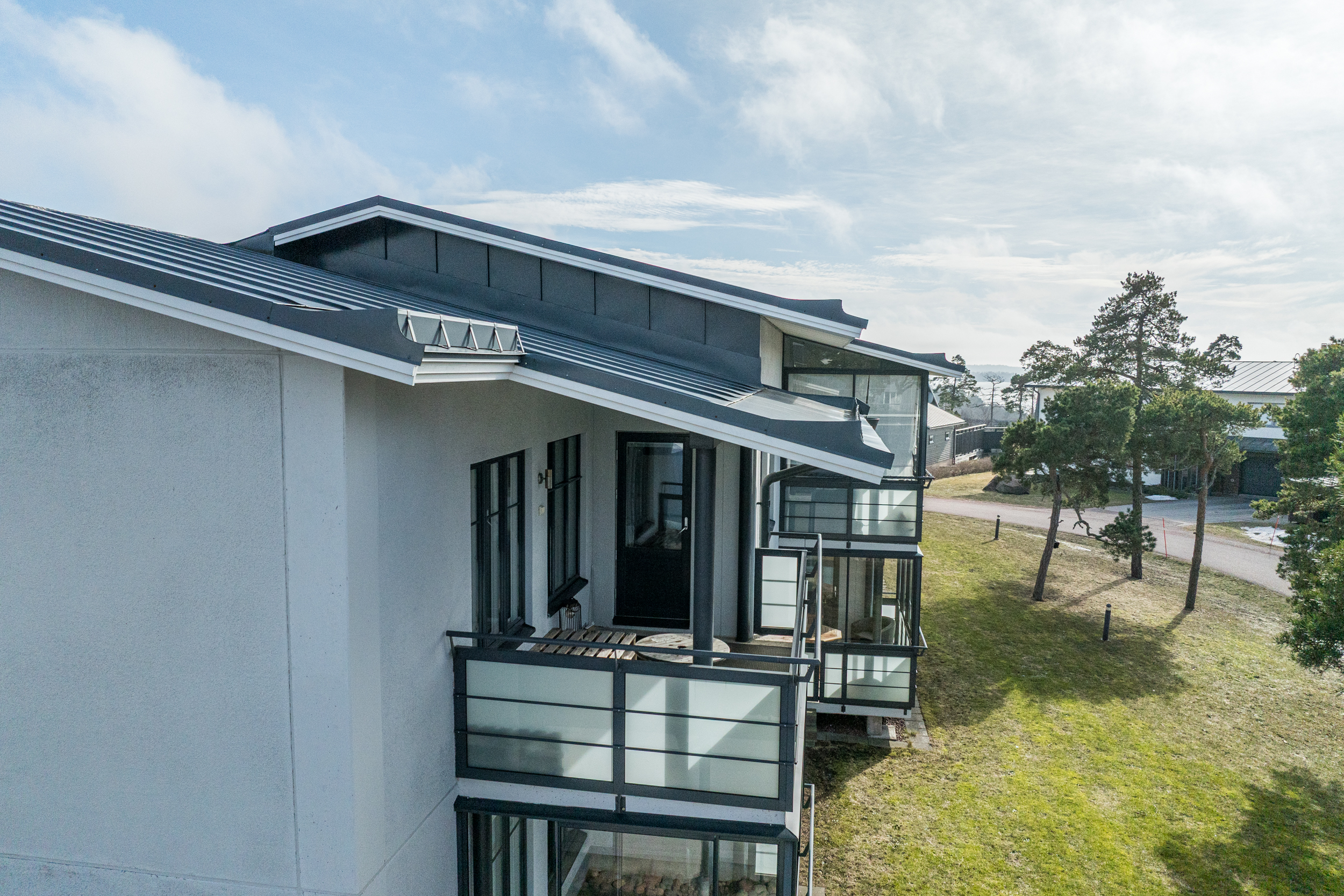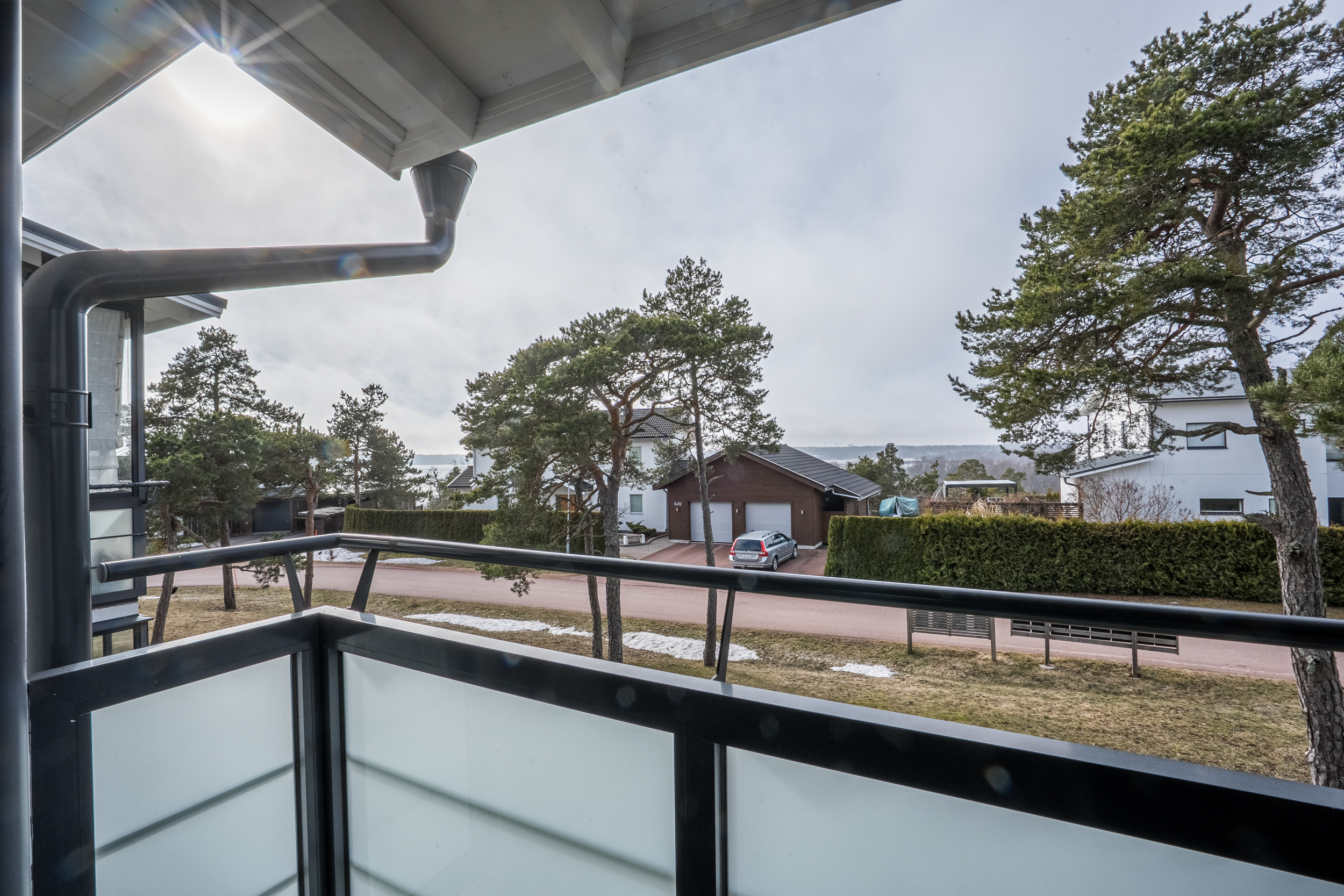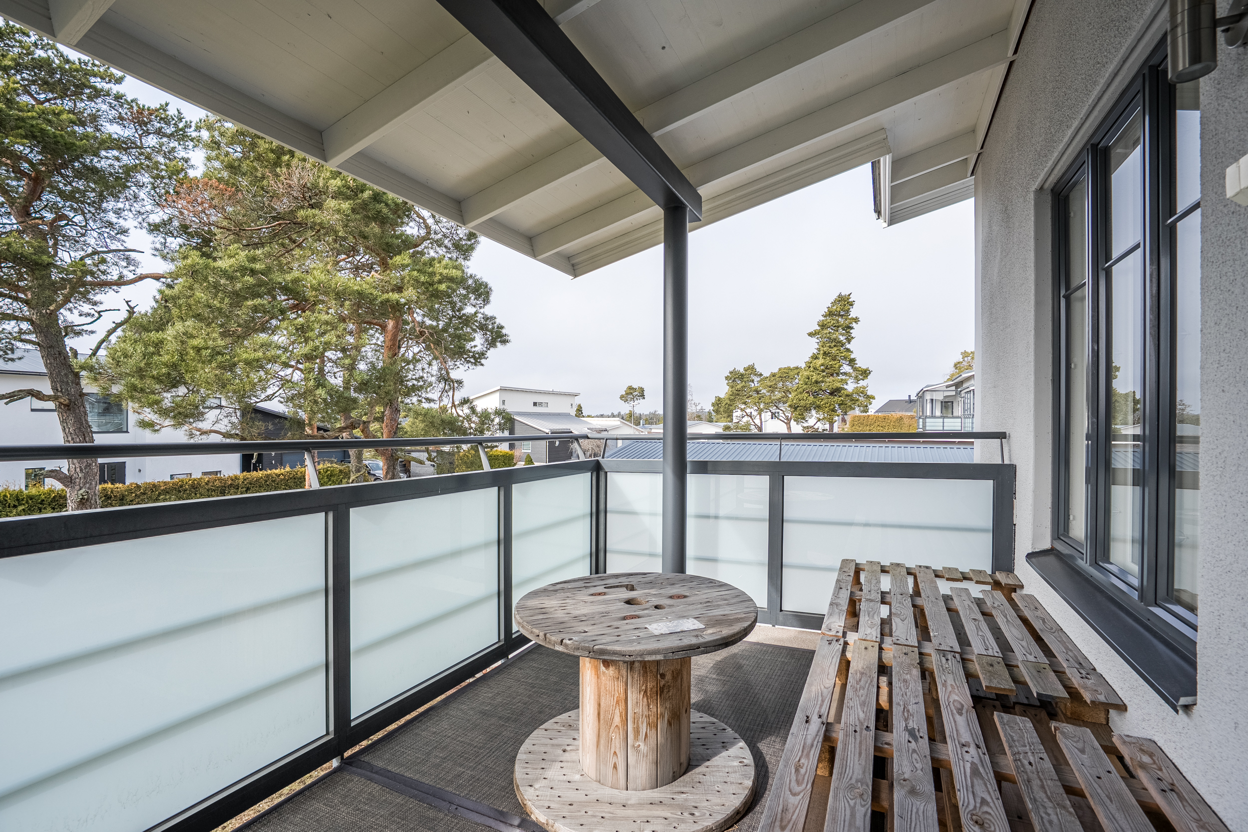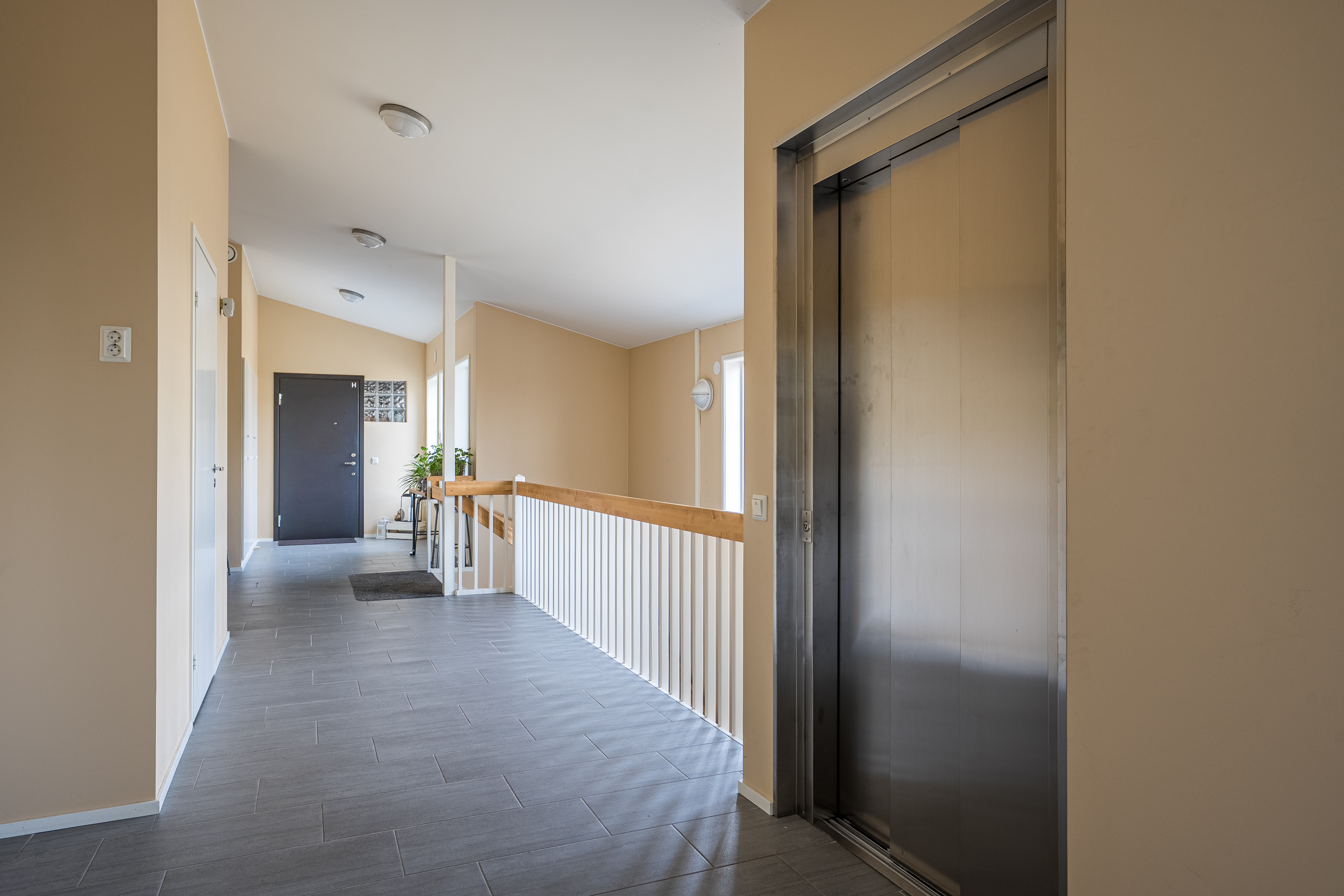 Modern trerummare med balkong och hiss i huset på Solberget.