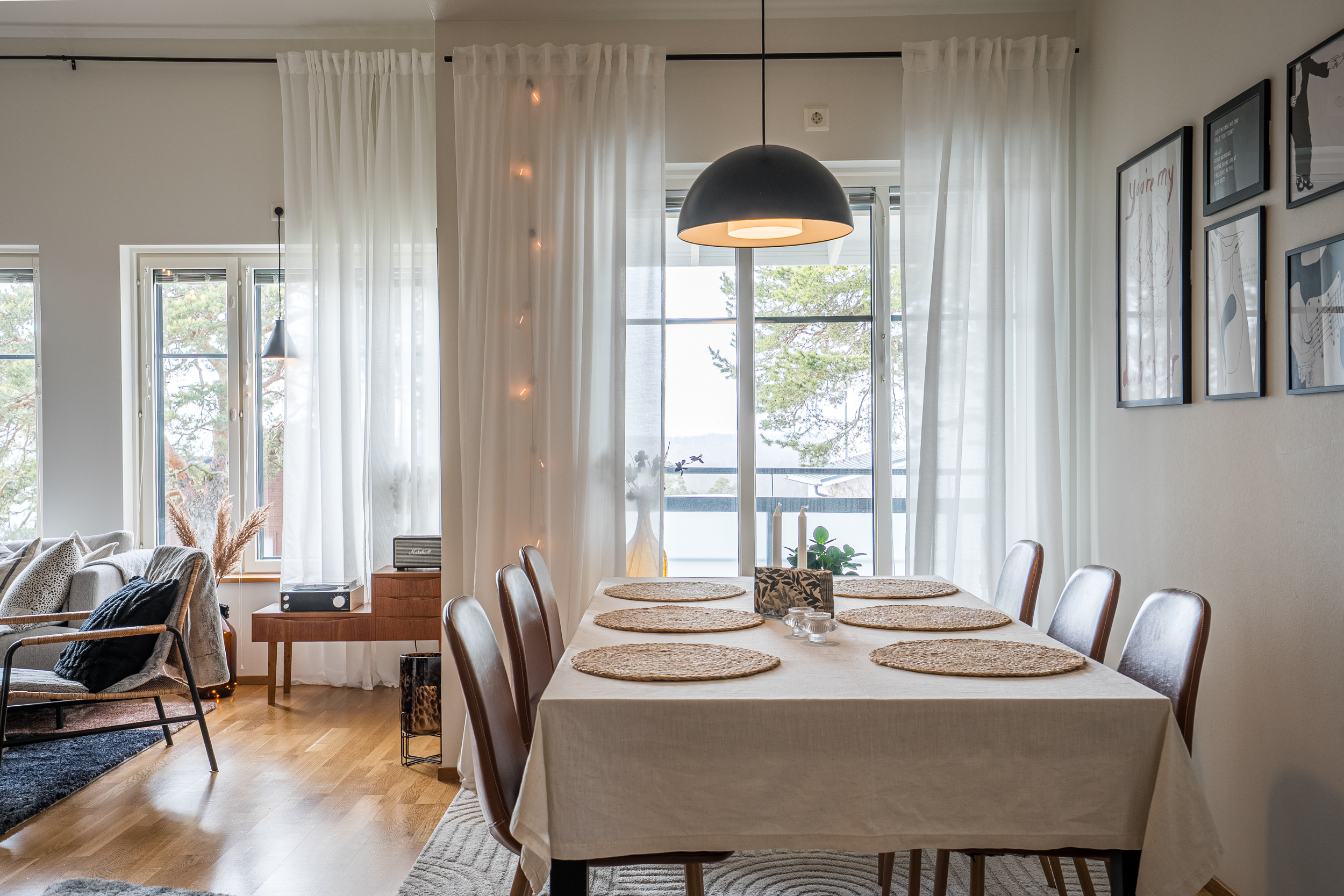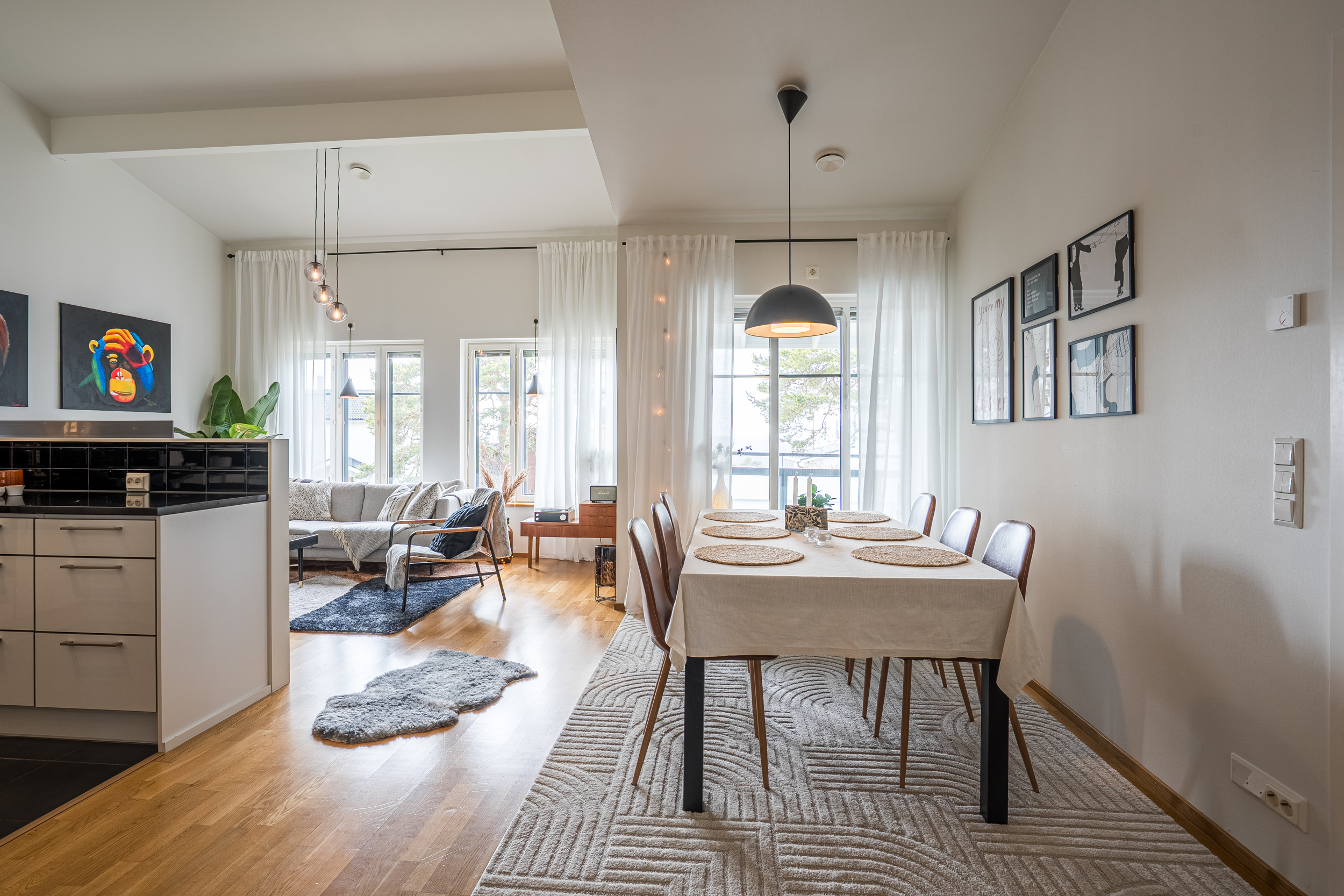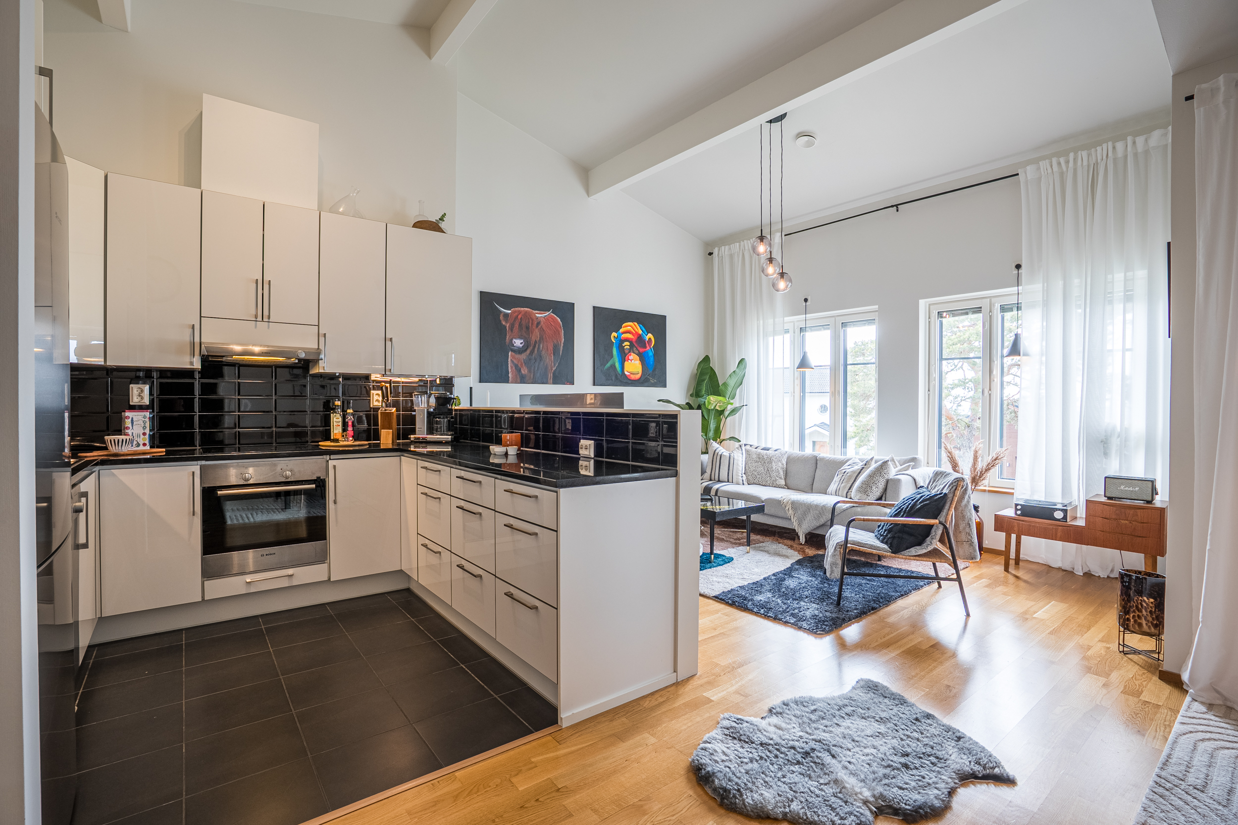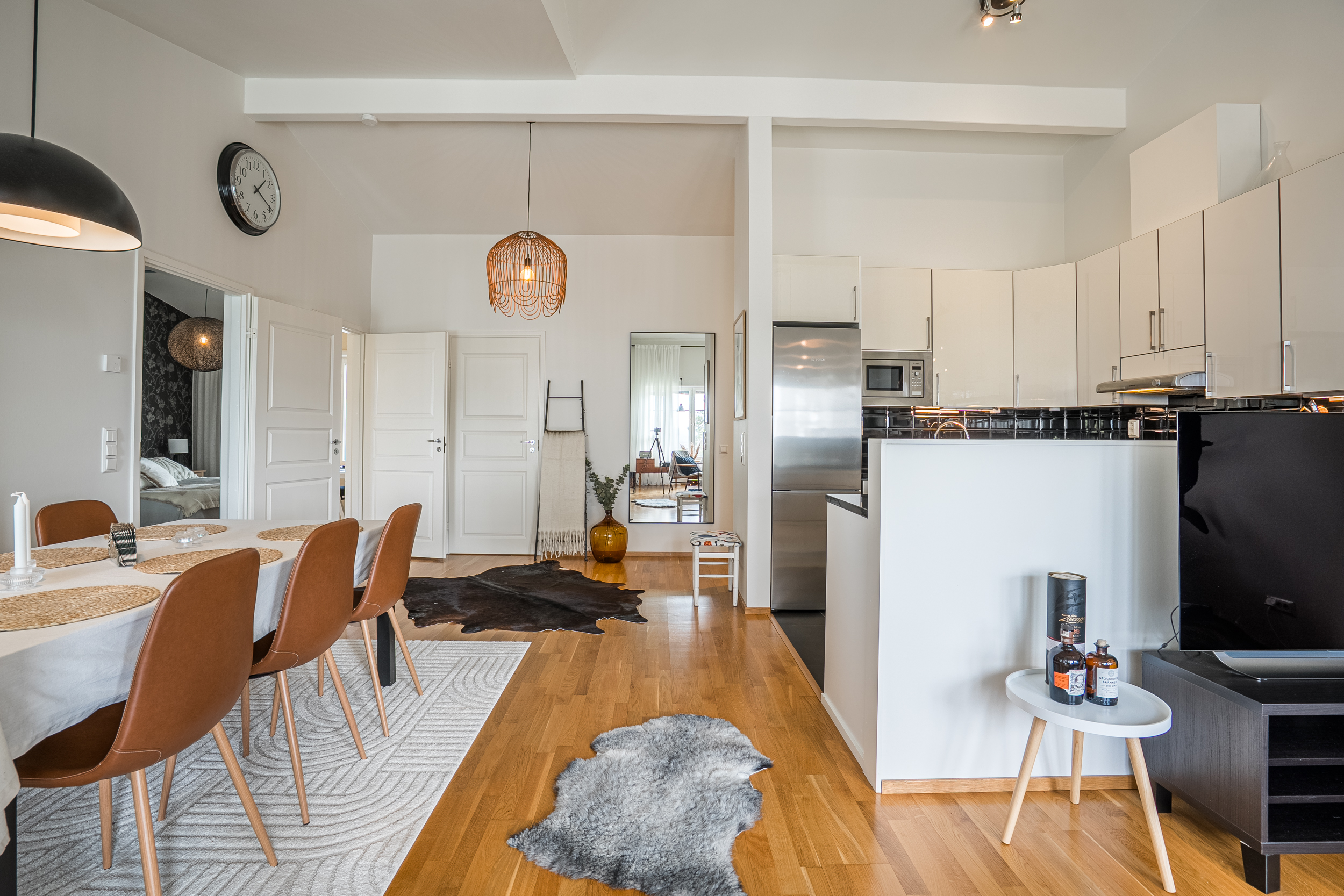 Planlösningen öppnar sedan upp mot kök, matplats och vardagsrum i en sammanhängande och social helhet med fint ljusinsläpp och mycket generös takhöjd. Köket är stilrent och praktiskt med bra arbetsytor och full maskinell utrustning. Här finns en naturlig koppling till matplatsen och vidare till vardagsrummet, som utgör bostadens centrala sällskapsyta. Från vardagsrummet nås balkongen i västerläge som är ett tydligt mervärde som också förbättrar bostadens användning under de varmare delarna av året. Här sitter man ostört i eftermiddagssolen med en fin sjöglimt över Slemmern. Bostaden rymmer två sovrum med goda förvaringslösningar, varav ett med spegelbeklädda skjutdörrar. Därtill finns en rymlig klädkammare som ger ett extra lager av funktionalitet. Genomgående parkettgolv i bostadsrummen tillsammans med det höga takvalvet ger ett luftigt och enhetligt intryck.