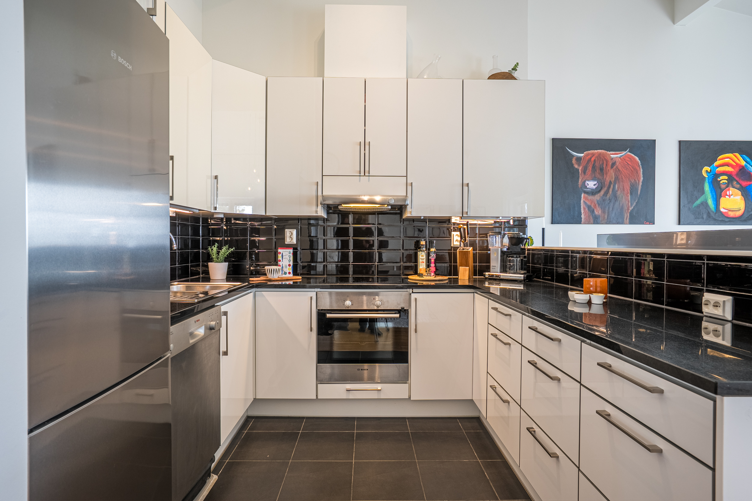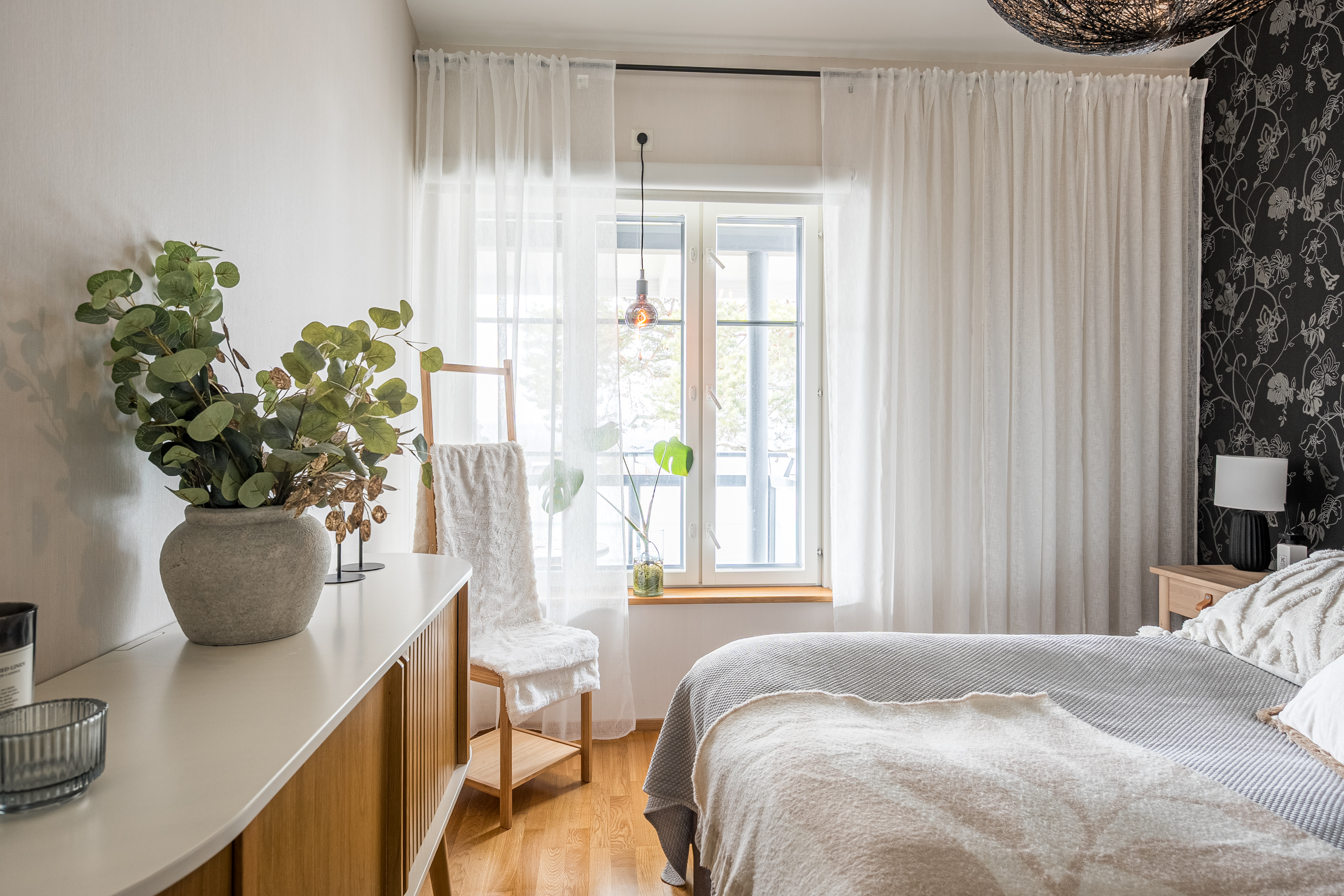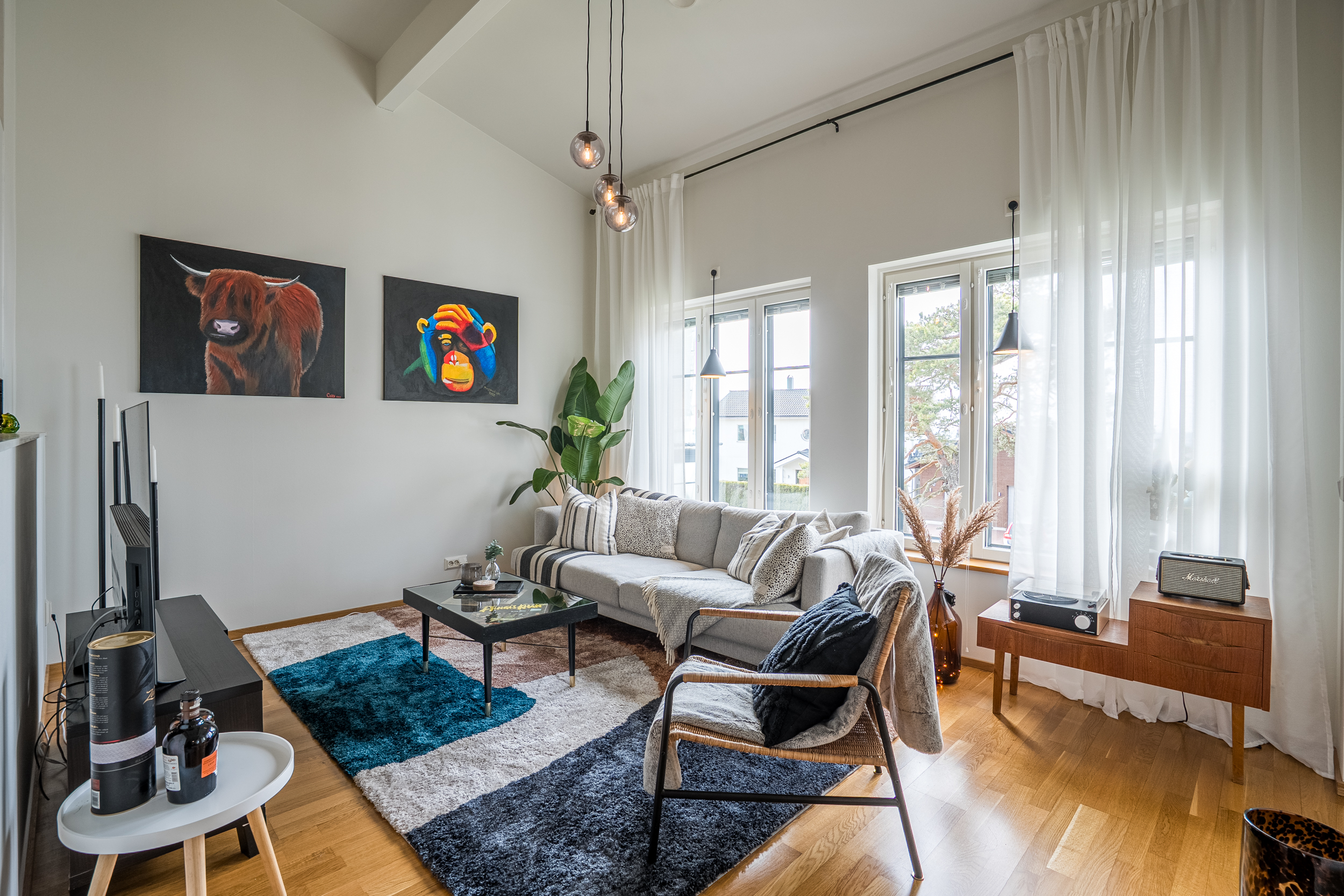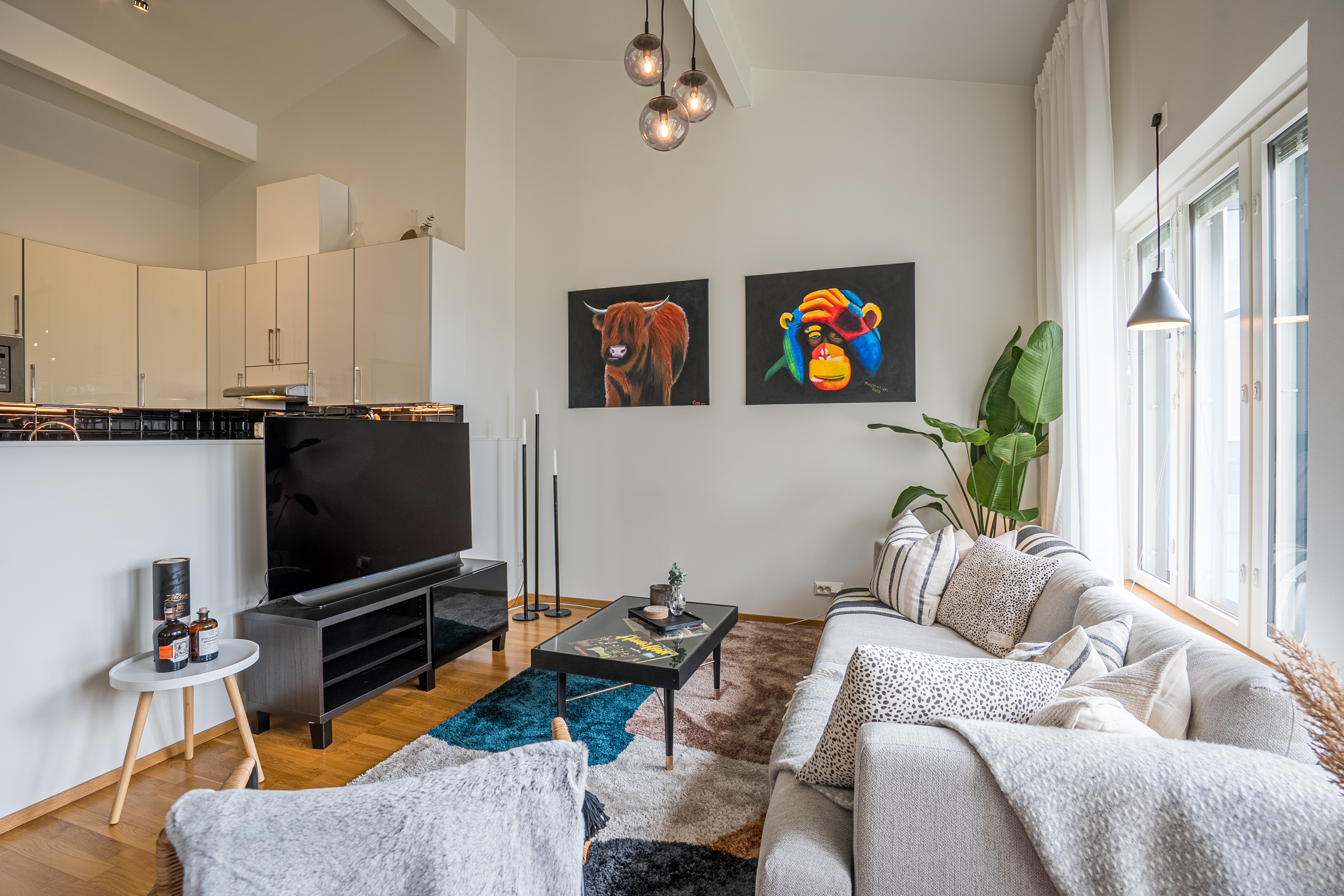 Planlösningen öppnar sedan upp mot kök, matplats och vardagsrum i en sammanhängande och social helhet med fint ljusinsläpp och mycket generös takhöjd. Köket är stilrent och praktiskt med bra arbetsytor och full maskinell utrustning. Här finns en naturlig koppling till matplatsen och vidare till vardagsrummet, som utgör bostadens centrala sällskapsyta. Från vardagsrummet nås balkongen i västerläge som är ett tydligt mervärde som också förbättrar bostadens användning under de varmare delarna av året. Här sitter man ostört i eftermiddagssolen med en fin sjöglimt över Slemmern. Bostaden rymmer två sovrum med goda förvaringslösningar, varav ett med spegelbeklädda skjutdörrar. Därtill finns en rymlig klädkammare som ger ett extra lager av funktionalitet. Genomgående parkettgolv i bostadsrummen tillsammans med det höga takvalvet ger ett luftigt och enhetligt intryck.
