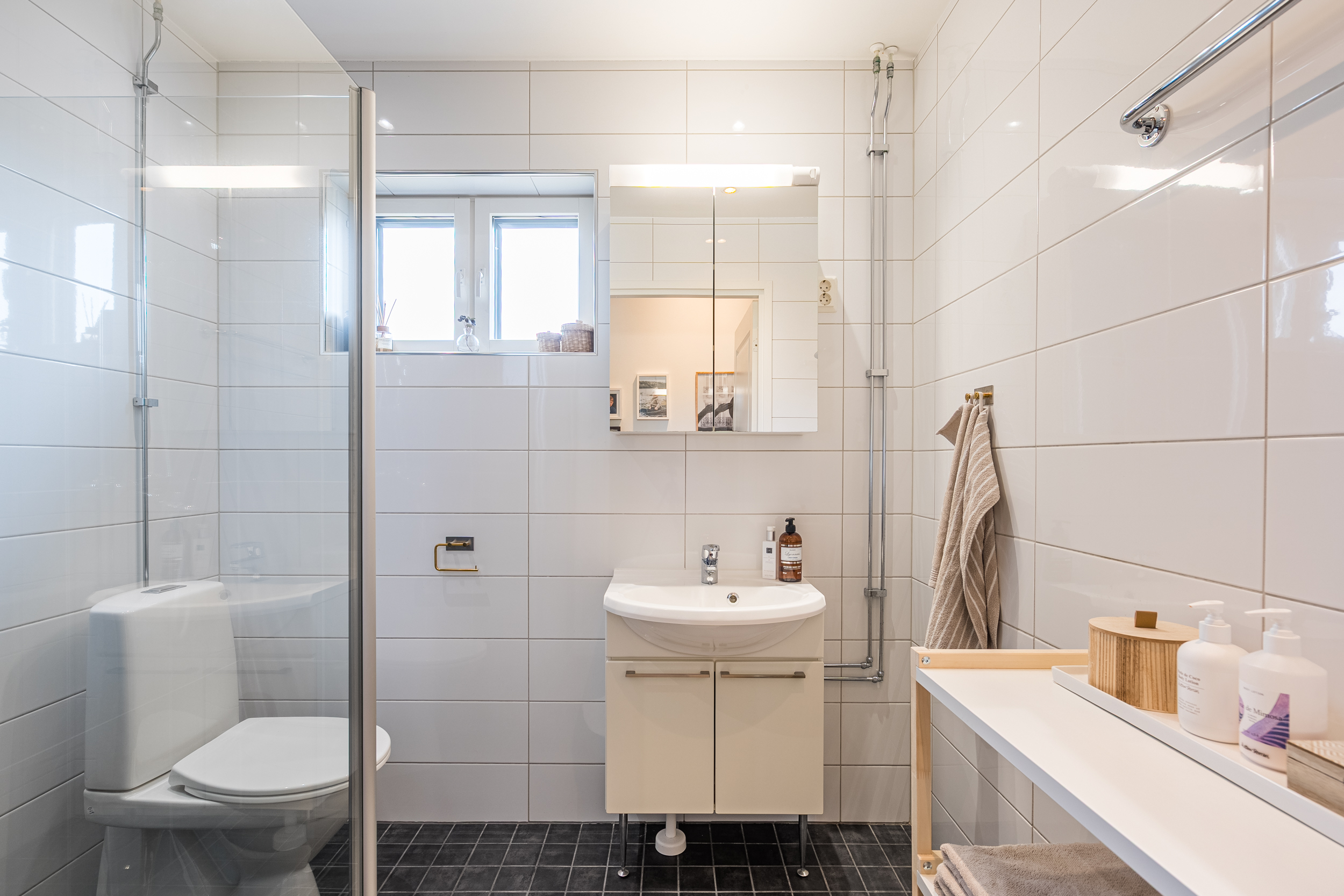 Det helkaklade badrummet är modernt och tidlöst, utrustat med dusch, wc, kommod och spegelskåp.
